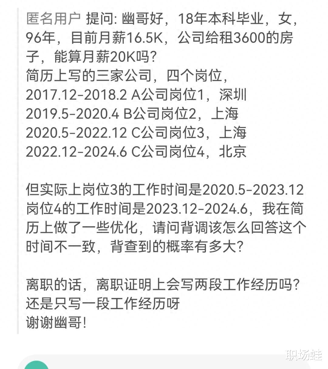 至于要不要说自己大致是月薪20K,当然可以这么美化一下,但是下家公司一般会问你要你的住宿费每月3600元的补贴证明,或者打进你的银行卡的流水证明,要么你用于报销房租的发票等等,总之空口无凭。