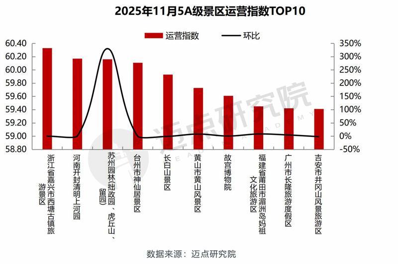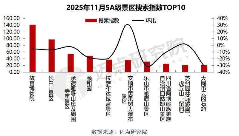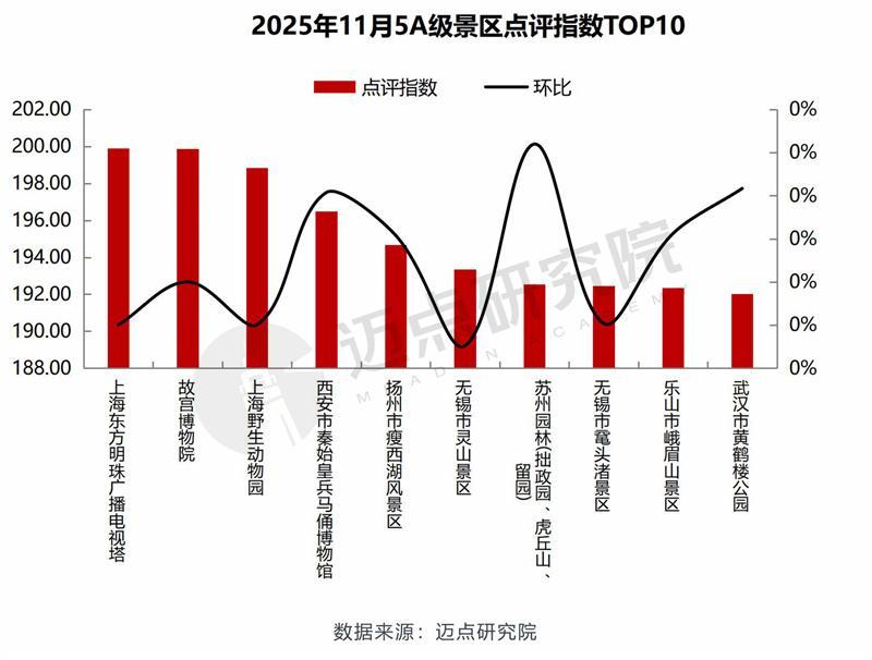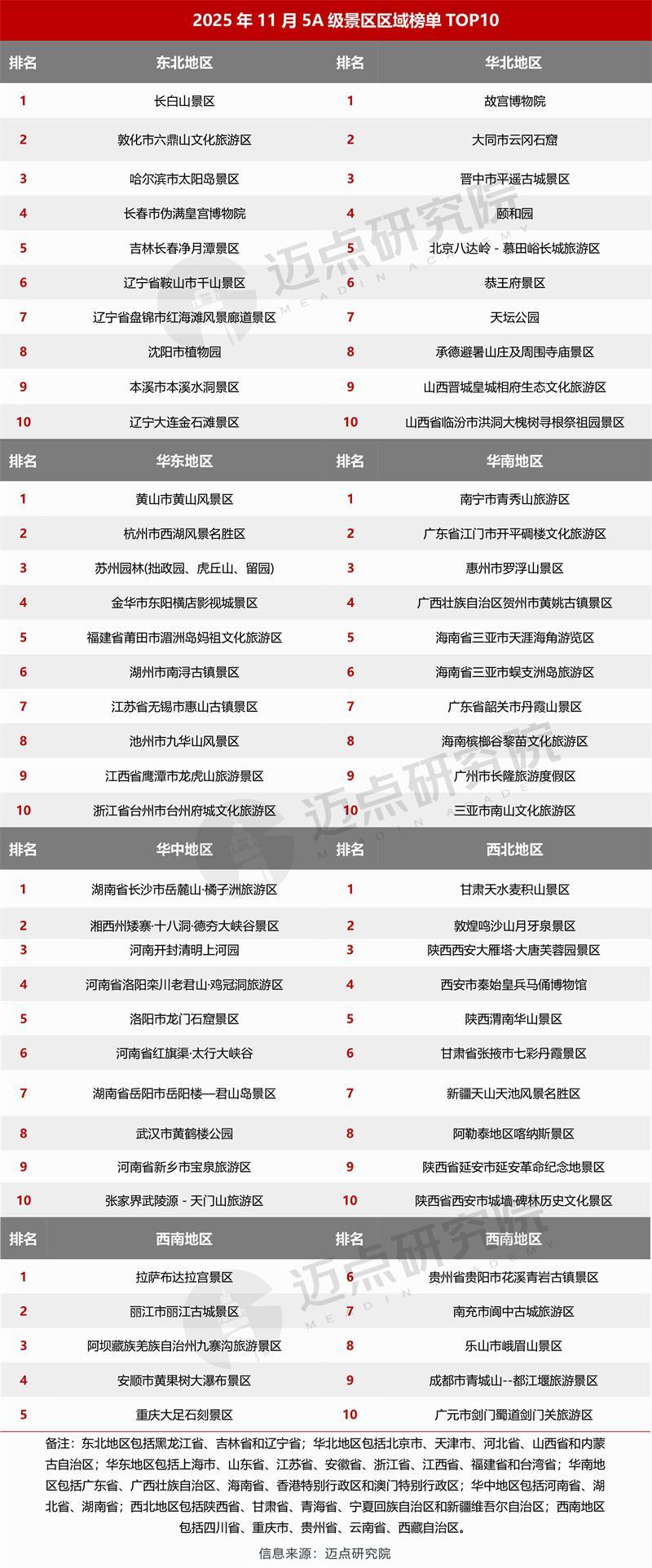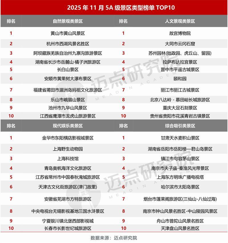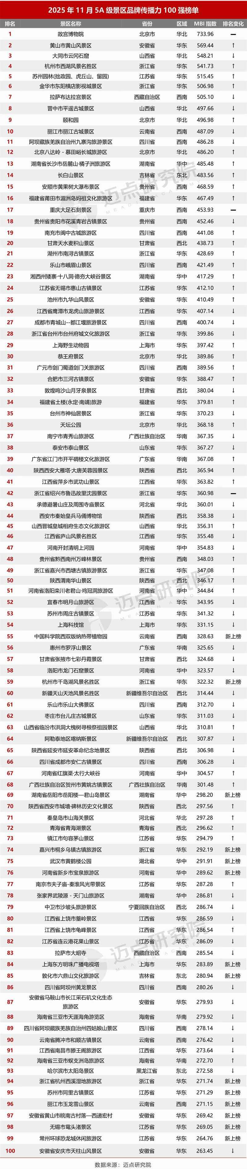 以下是迈点研究院独家发布“2025年11月5A级景区品牌传播力(MBI)100强榜单”。11月,故宫博物院、黄山市黄山风景区、大同市云冈石窟、杭州市西湖风景名胜区、苏州园林(拙政园、虎丘山、留园)、金华市东阳横店影视城景区、拉萨布达拉宫景区、晋中市平遥古城景区、颐和园、丽江市丽江古城景区位列榜单前十。本月百强景区中,排名环比上升41家、下降42家、3家保持不变、14家新上榜。