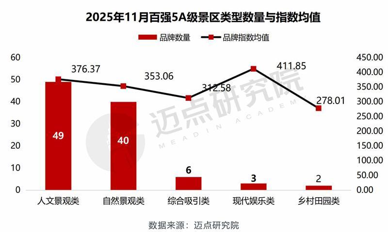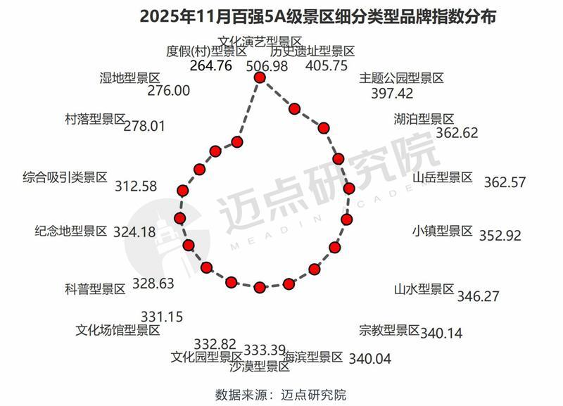 2025年11月,百强5A级景区细分类型品牌指数位列前五的为文化演艺型景区、历史遗址型景区、主题公园型景区、湖泊型景区、山岳型景区。其中,仅主题公园型景区品牌指数环比增长,其余均下滑,凸显出该类型景区凭借其多元化的体验项目、强互动的产品形态在淡季市场具备更强的竞争优势。