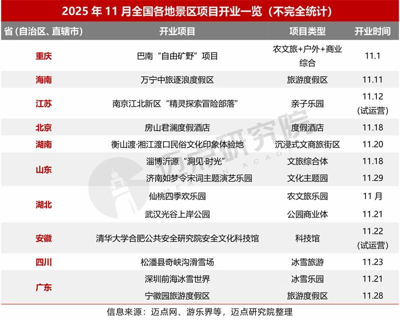 据迈点研究院不完全统计,11月新开业文旅景区项目13个,环比下降169%,受季节性因素影响,项目开业进度放缓。开业项目类型既包括契合冬季消费的冰雪项目如有深圳前海冰雪世界、四川松潘滑雪场,也涵盖家庭亲子、沉浸式民俗、文化主题游乐、度假酒店等场景,适配不同群体的休闲需求。