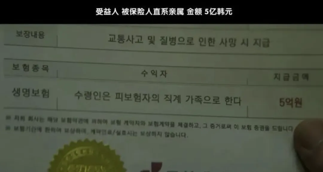 里面有现金,有金表,还有一张闪着魔鬼光的纸,保险单。写着意外死亡,赔偿五亿韩元。