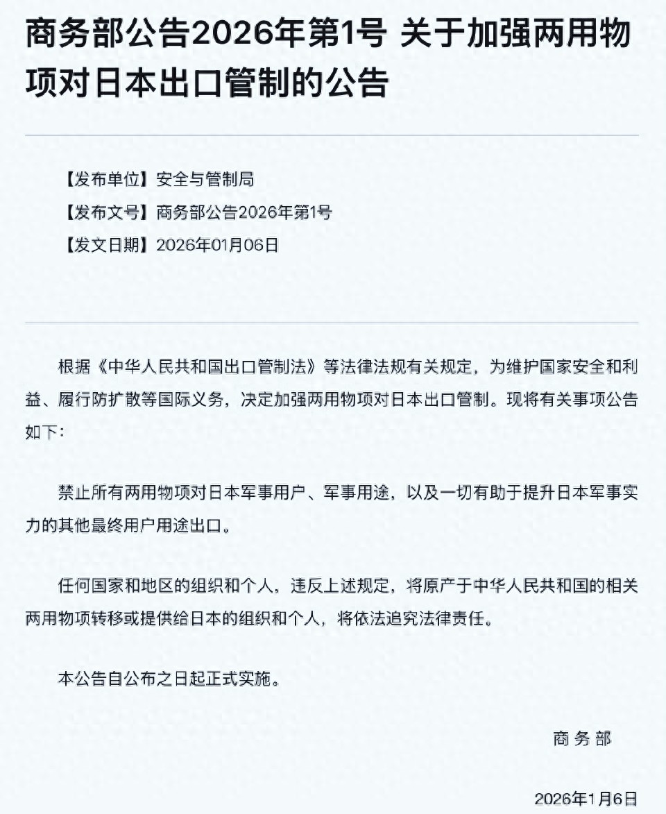 1月6日,我商务部发布公告,加强两用物项对日本出口管制。