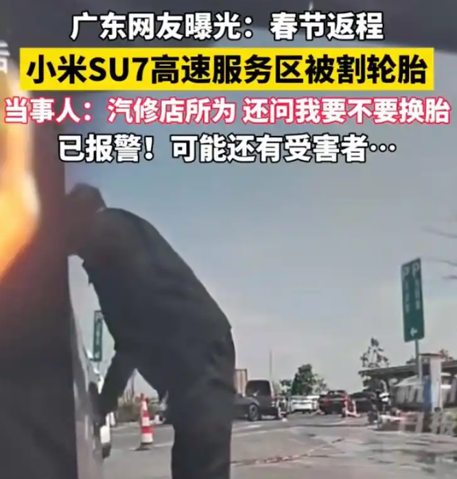事件经过:2025 年 2 月 4 日,有网友发文称其朋友驾驶小米 SU7,将车停在广东省阳江市沈海高速(阳茂段)新墟服务区的汽修店门口去上厕所,手机很快收到胎压异常提醒。返回车前时,有陌生男子上前询问是否需要补胎。车主通过车辆视频发现,一名身穿黑上衣黑裤子、戴白手套、手持工具的陌生男子靠近车辆,在车胎处停留几秒后离开。该网友还称当天出服务区时还有另外 3 个人的车爆胎。