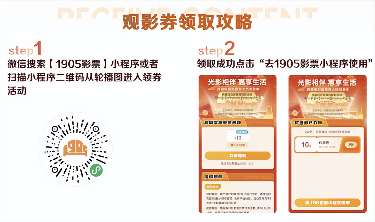 活动期间,用户可通过1905影票小程序领取“满10.1元立减10元”观影消费券。每位用户可领取2张,消费券自领取之日起7天内有效,可在西藏自治区内所有合作影院使用,适用于活动期间所有在映影片。这一举措将切实降低群众观影成本,让文化惠民政策落到实处。