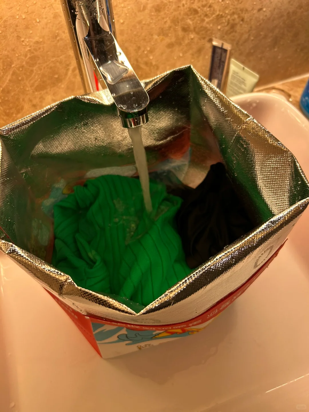 出去旅行或者出差,可以在行李箱当中装两个奶茶袋子,把它当成盆来使用,平常我们清洗内衣内裤等小件的衣服没有盆洗不干净,可以把奶茶袋子打开当成盆来使用。
