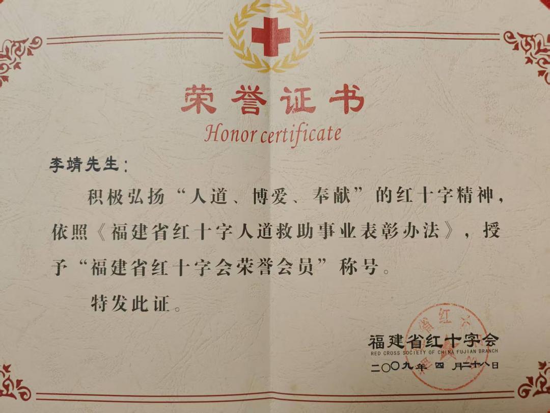 2009年4月福建省红十字会授予李靖的“福建省红十字会荣誉会员”荣誉证书。