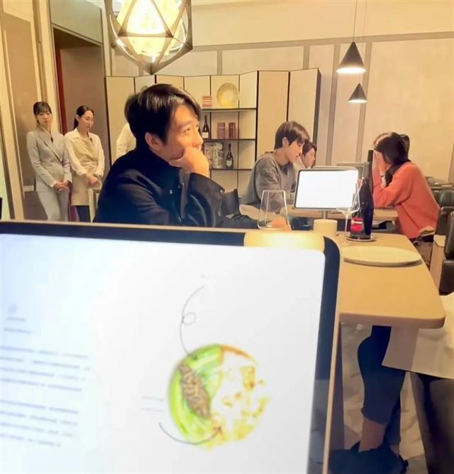 在餐厅里,俞灏明满目柔情地看着王晓晨,仿佛沉浸在自己的小世界里。