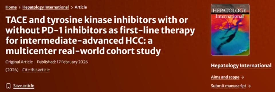 参考文献:Yang XG, Deng LW, Zhao Y, et al. TACE and tyrosine kinase inhibitors with or without PD-1 inhibitors as first-line therapy for intermediate-advanced HCC: a multicenter real-world cohort study. Hepatol Int. Published online February 17, 2026. doi:10.1007/s12072-026-11052-0