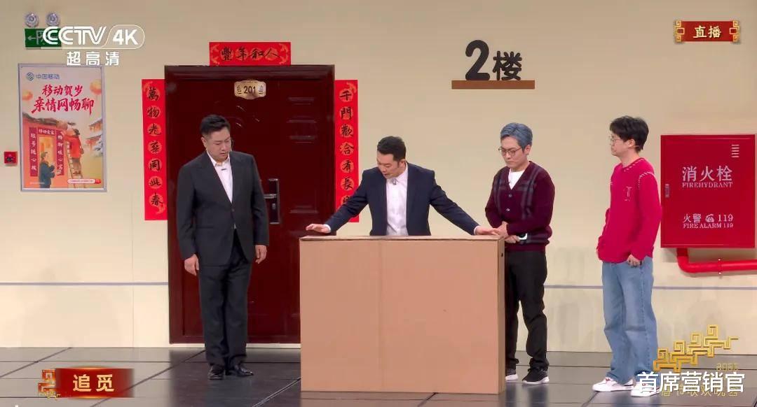 而零点前的小品《又来了》场景切换到养鸡示范合作社。养鸡户王大哥在接待室里迎来送往一波波调查团,墙上同样有中国移动的海报默默陪伴。背景海报的巧妙出现,都让这份陪伴感在阖家围坐的场景中,显得格外自然。