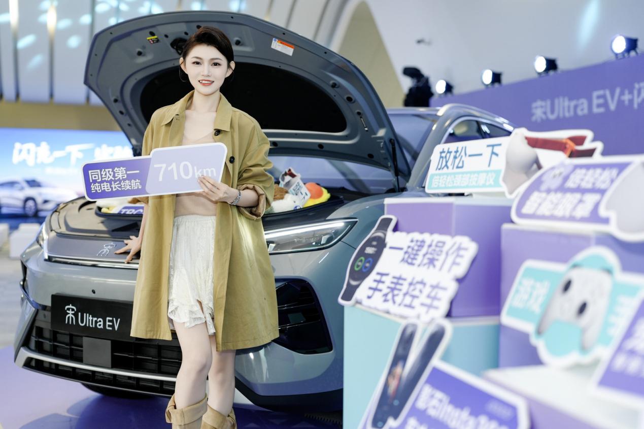宋Ultra EV 搭载第二代刀片电池、闪充技术及激光雷达三大行业颠覆性技术。新车搭载的闪充技术带来出行新体验。常温下,5分钟电量告急秒“回血”,喝杯咖啡、刷会视频就能继续出发;9分钟从10%充到97%,节假日出行无需久留服务区。零下30℃也仅多3分钟。充电如加油,告别久等焦虑与规划,畅享纯电出行松弛感。现场特设一首歌的时间闪充体验区,嘉宾可现场直观感受,一曲唱罢,电量高效补能,闪充实力一目了然。