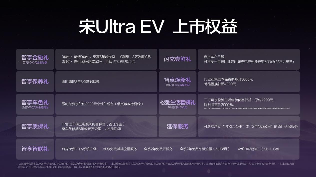 比亚迪王朝正在构建一个从购车、用车、到养车的全链路无忧体系。为此,宋Ultra EV带来了“0元购、0元用、0元养”的超重磅购车权益!同时还有其他丰富权益,为用户带来超值购车体验。