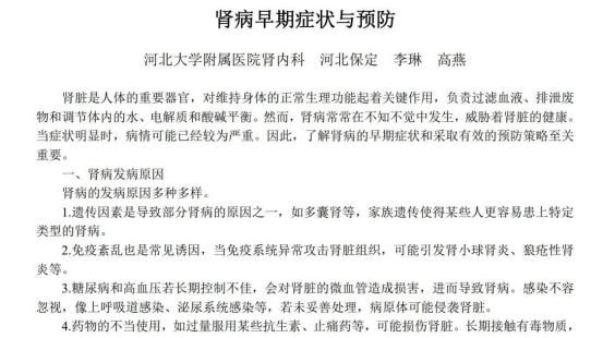 参考资料:[1]李琳.肾病早期症状与预防[N].山西科技报,2024-07-22