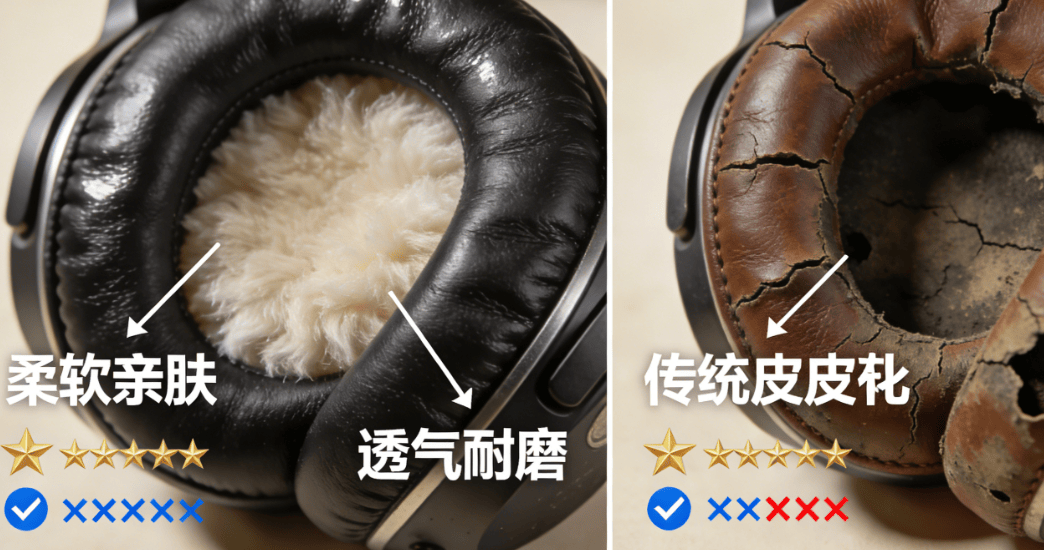蛋白皮+记忆棉耳罩为优选,柔软亲肤、透气耐磨,比真皮更抗老化,且易清洁。人体工学设计能均匀分散压力,长时间佩戴无压迫感,适配高频日常使用。