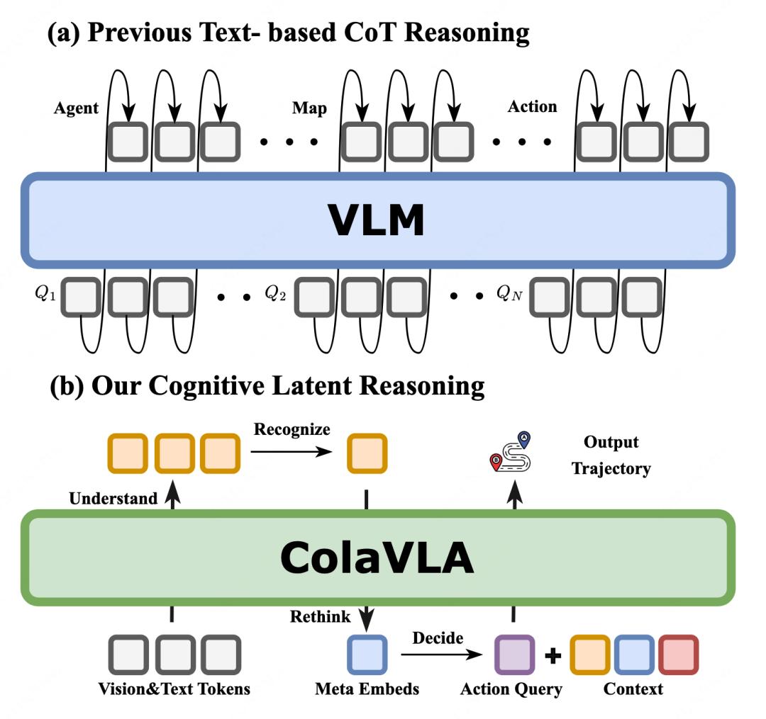 这条路线听起来很合理,但真正落到自动驾驶上,很快就会遇到一个问题:很多方法虽然引入了大模型,却仍然把「推理」做成了文本链式推理。也就是说,模型要先生成中间解释,再把这些解释一步步转成动作或轨迹。这样做的优点是看起来 「更会思考」,但代价也非常明显:文本是离散 token,而轨迹是连续控制;文本推理还依赖自回归解码,速度慢、链路长,不太适合实时驾驶。