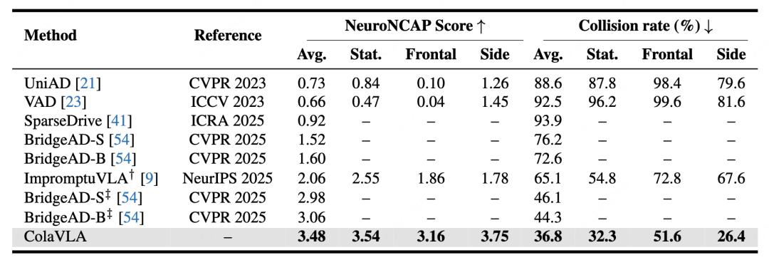 在更关键的闭环评测 NeuroNCAP 中,ColaVLA 的平均得分达到 3.48,平均碰撞率降到 36.8%,明显优于多种前序方法。