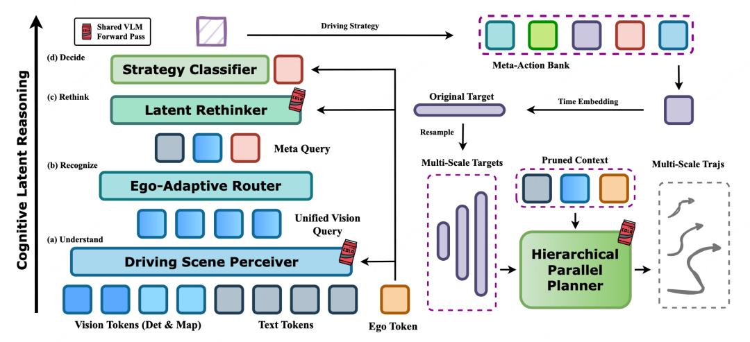 Cognitive Latent Reasoner:负责完成高层驾驶认知 Hierarchical Parallel Planner:负责把高层策略展开成连续轨迹作者的目标不是简单把一个大模型接到规划器前面,而是重新定义「推理」和「动作」之间的接口,让二者真正对齐。