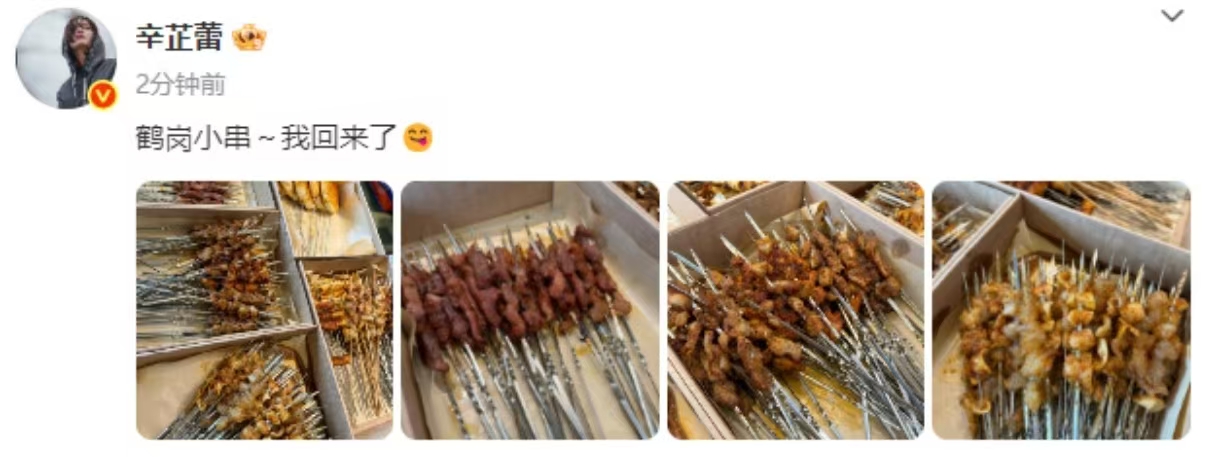 11月13日,辛芷蕾在社交平台晒出在老家鹤岗吃烧烤的照片,配文“鹤岗小串~我回来了”,仿佛在说:“这鹤岗小串,真是我的心头好!”引发网友热议,原来明星也是吃货。