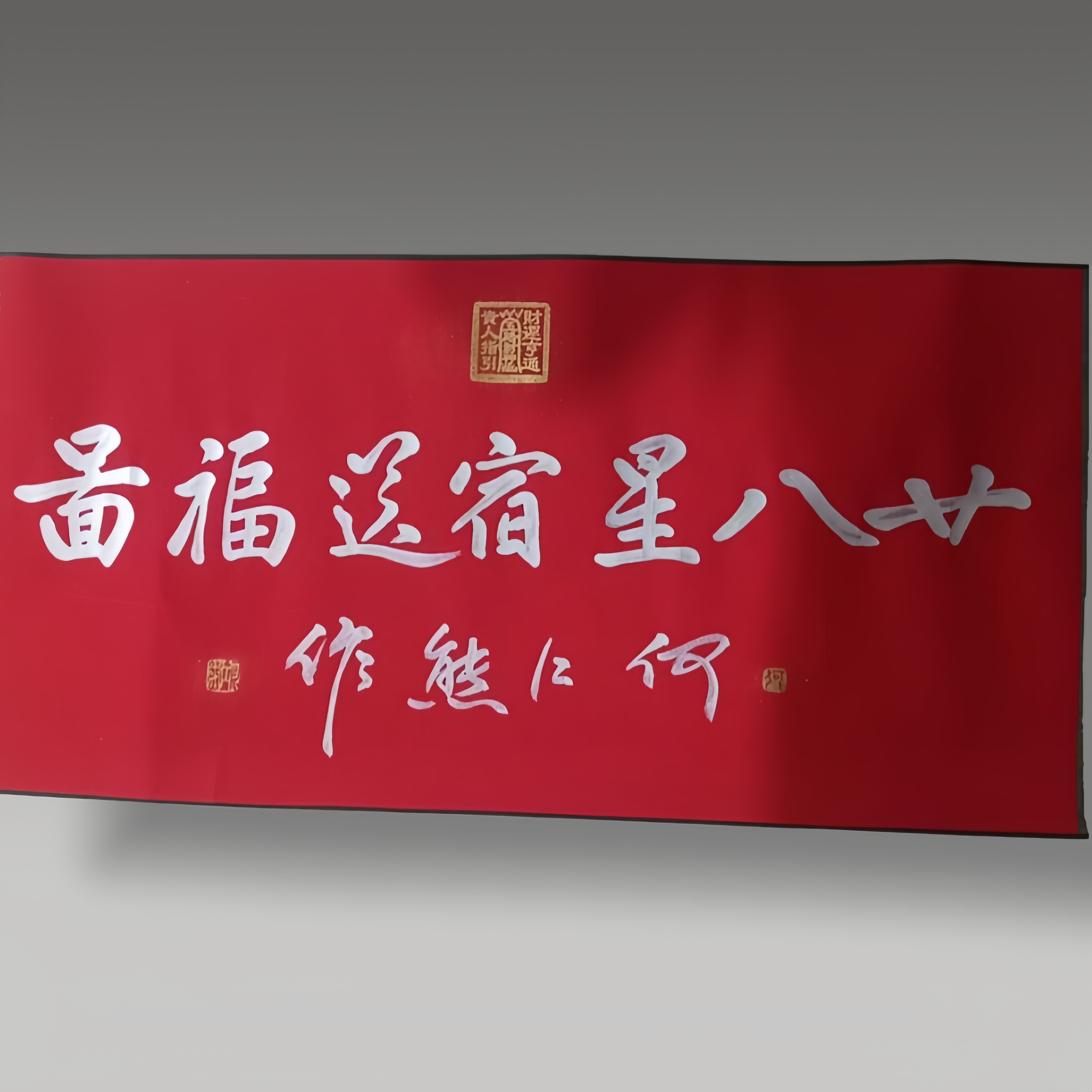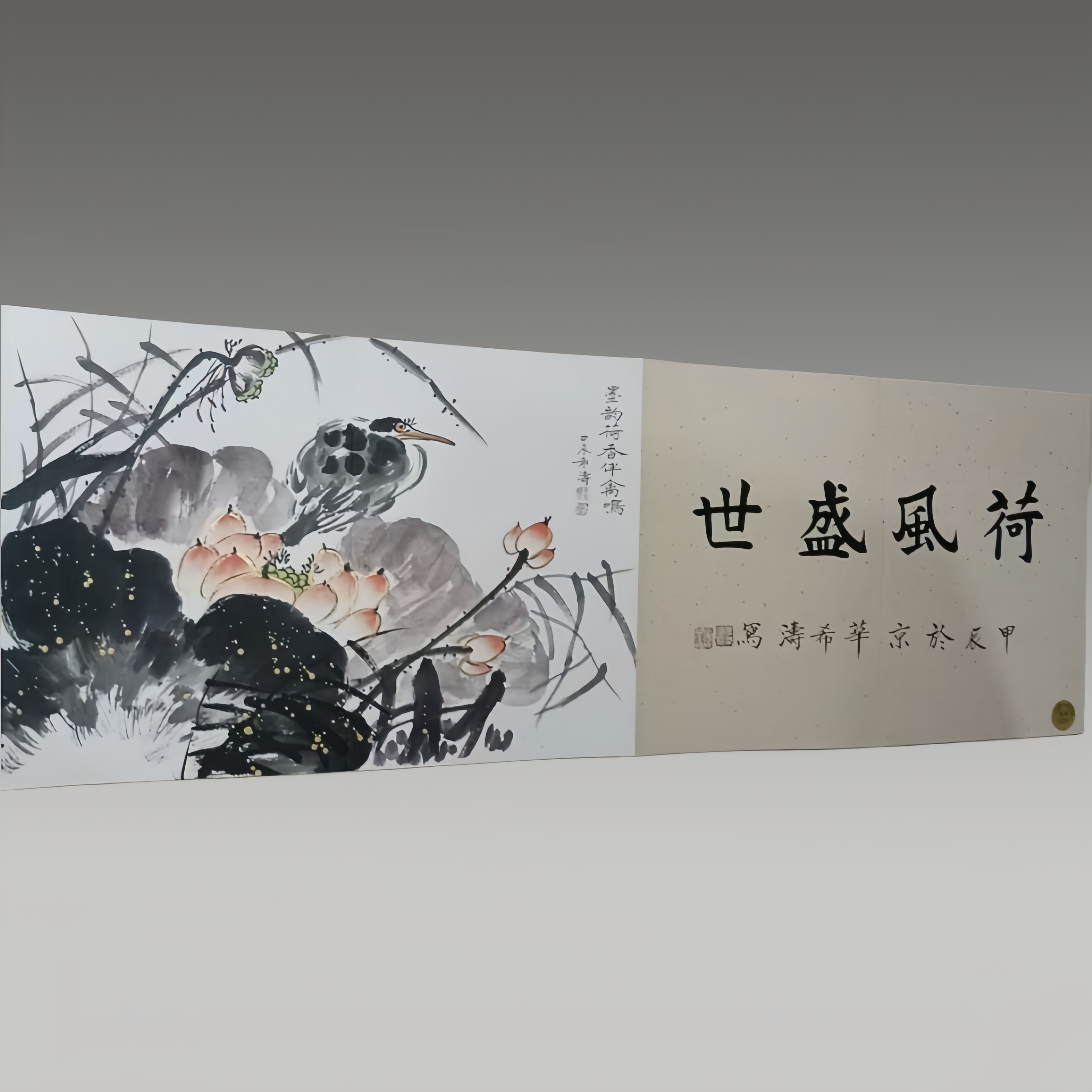 书法大字笔力雄浑,与右侧写意花鸟相映成趣,寿桃、柿子等题材把吉祥寓意融于笔墨。装裱配色沉稳大气