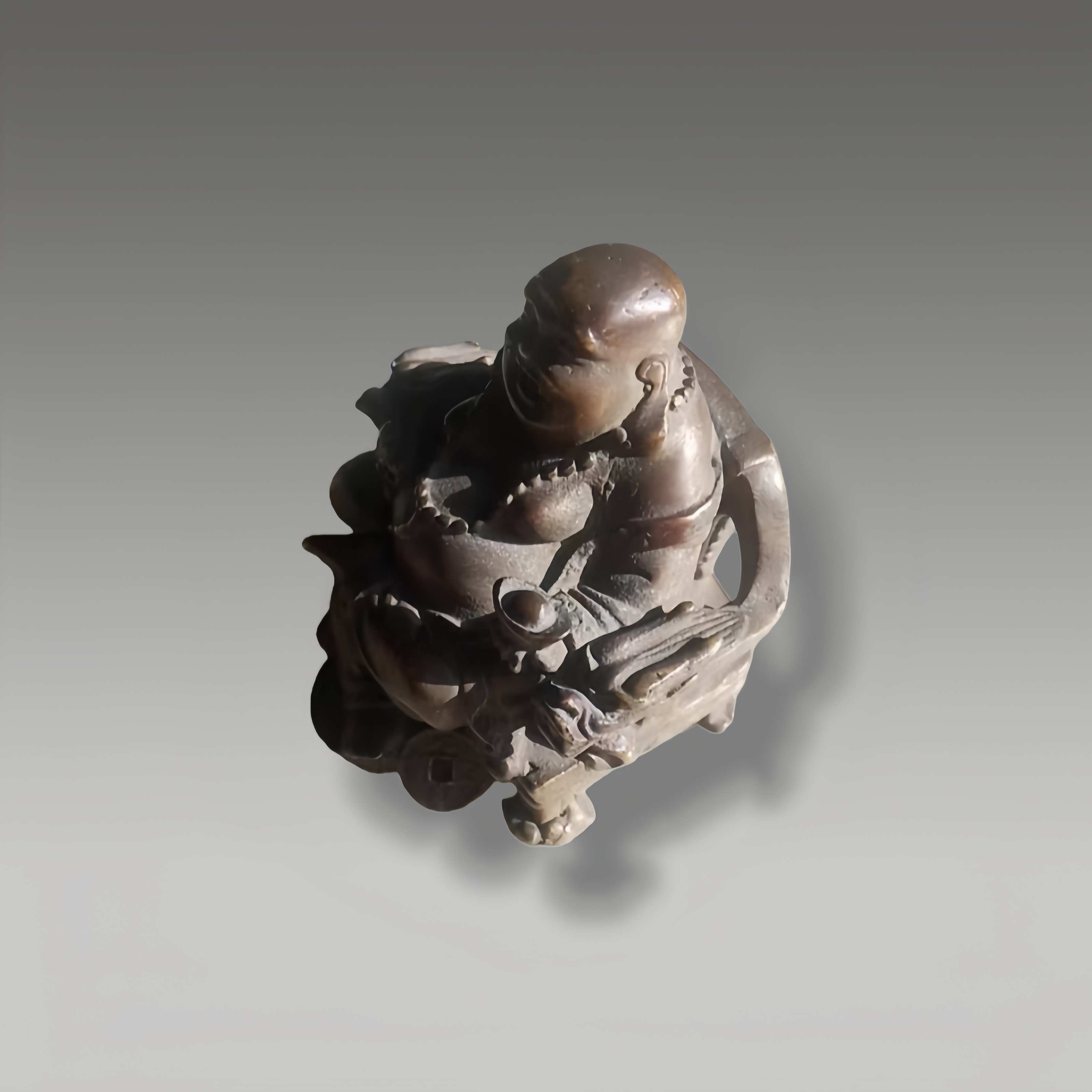 铜塑弥勒笑坐,福字镌于背,神态憨然传神,雕工凝练见巧思,藏纳吉祥意韵
