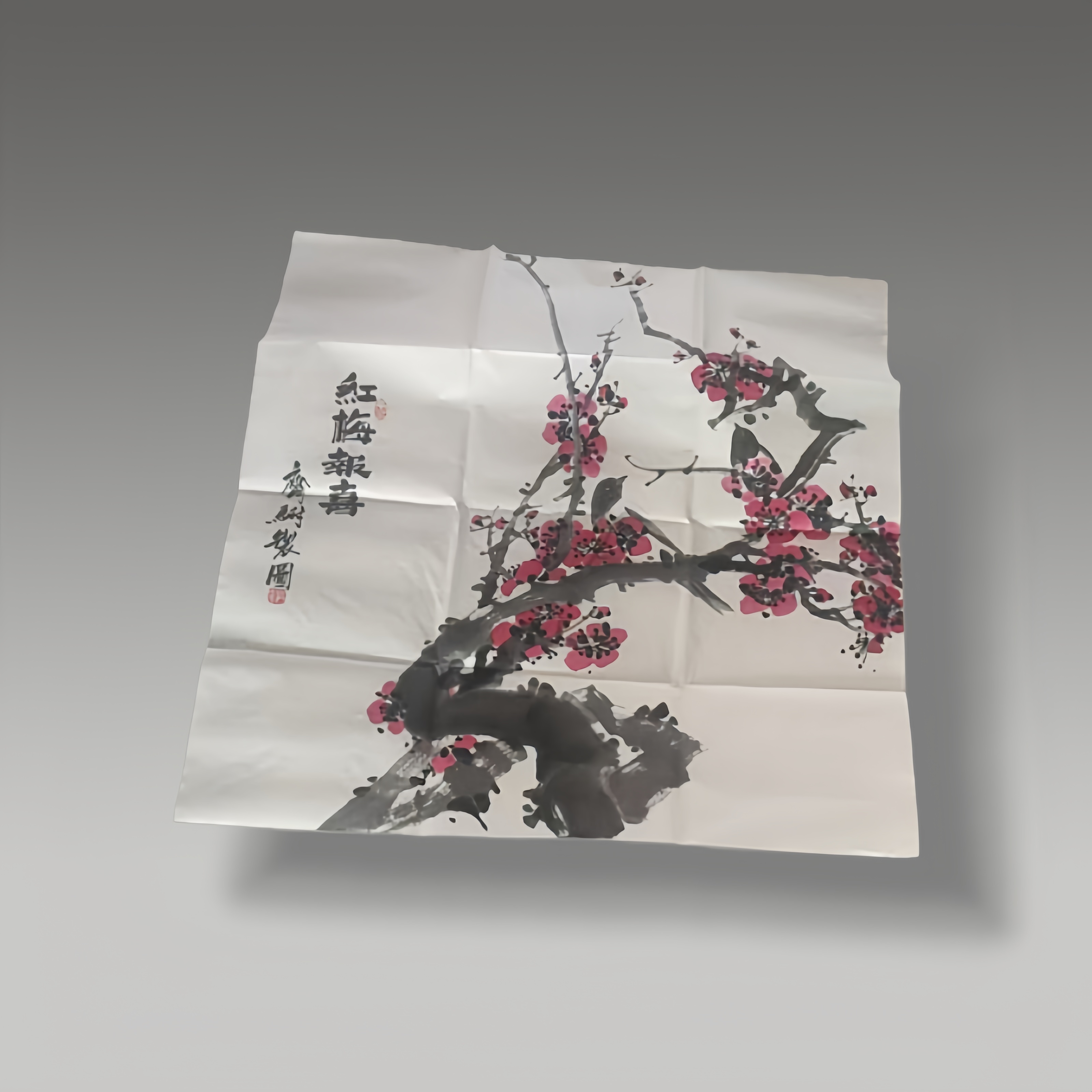 墨笔绘梅枝苍劲老辣,笔触豪放见风骨。红梅以重彩点染“报喜”寓意吉祥,尽显写意花鸟的笔墨意趣与审美巧思