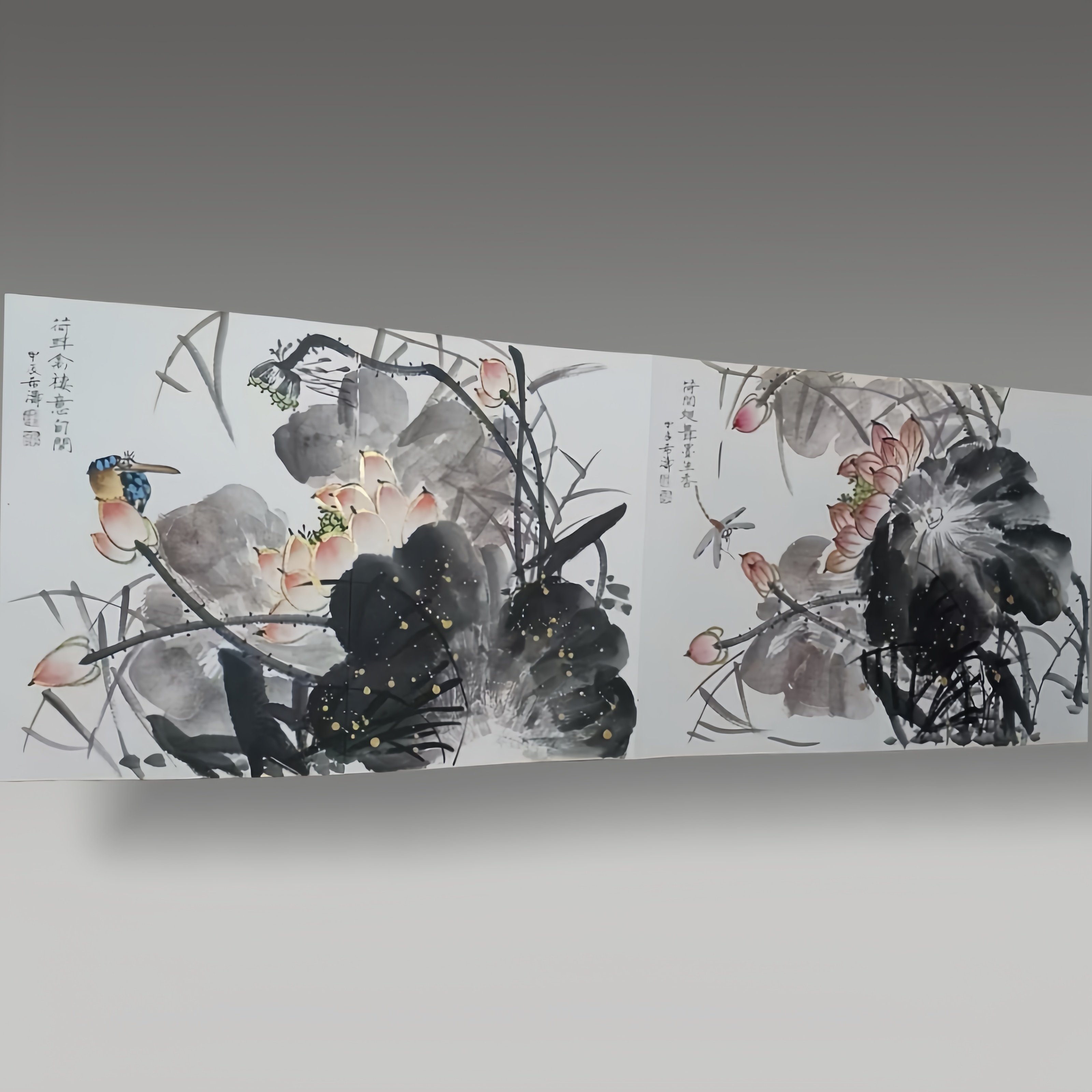 浓淡墨色晕染出荷叶的层叠意趣,粉荷娇妍灵动,蜻蜓、翠鸟点缀其间更添生趣。笔锋藏露间尽是写意花鸟的神韵