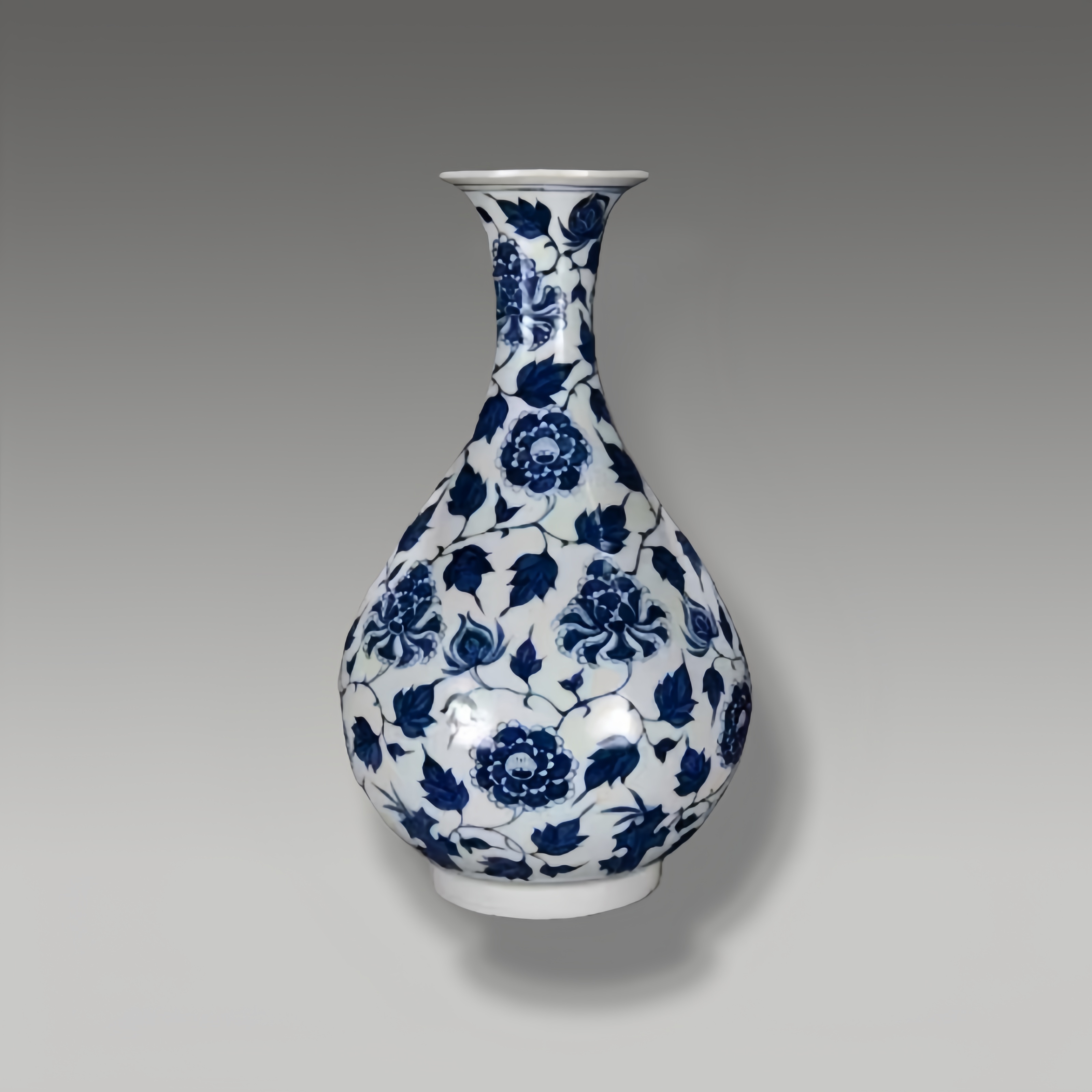 这件青花玉壶春瓶青花发色浓妍,缠枝花卉纹绘工细腻,器型线条柔美流畅,尽显青花瓷的雅致与工艺之美