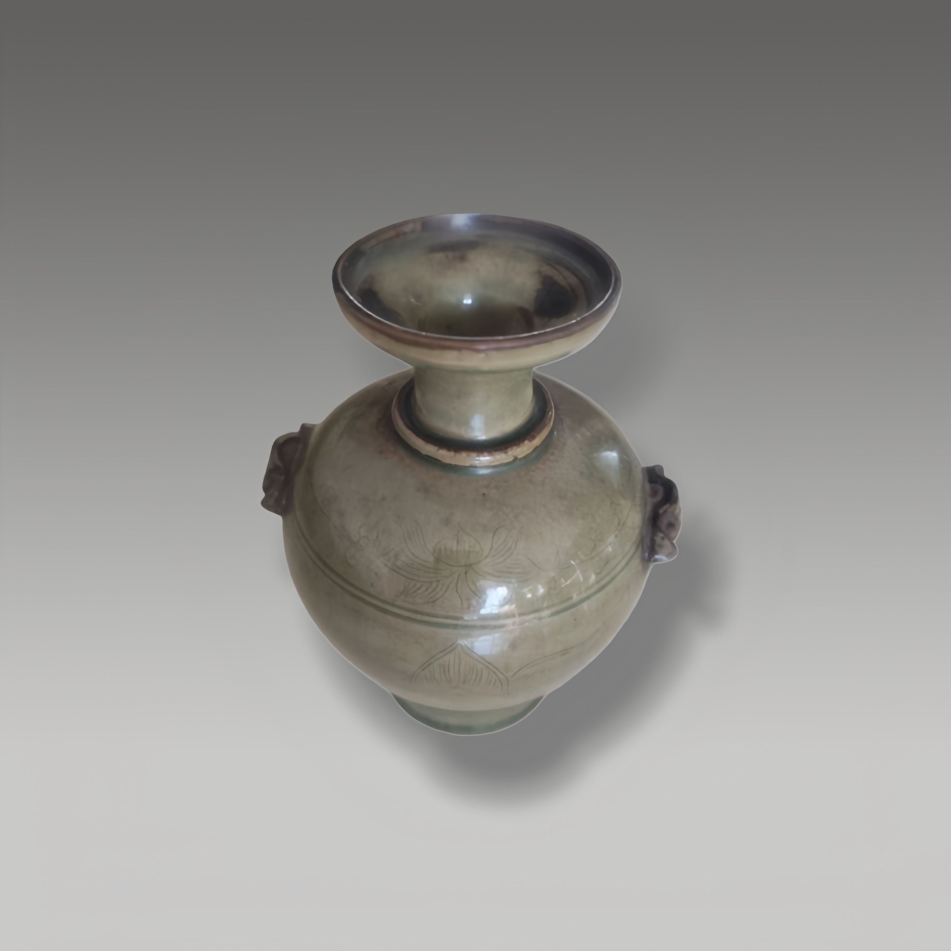 盘口、束颈、鼓腹,瓶身饰有暗刻花纹,两侧铺首衔环,工艺古朴,韵味典雅