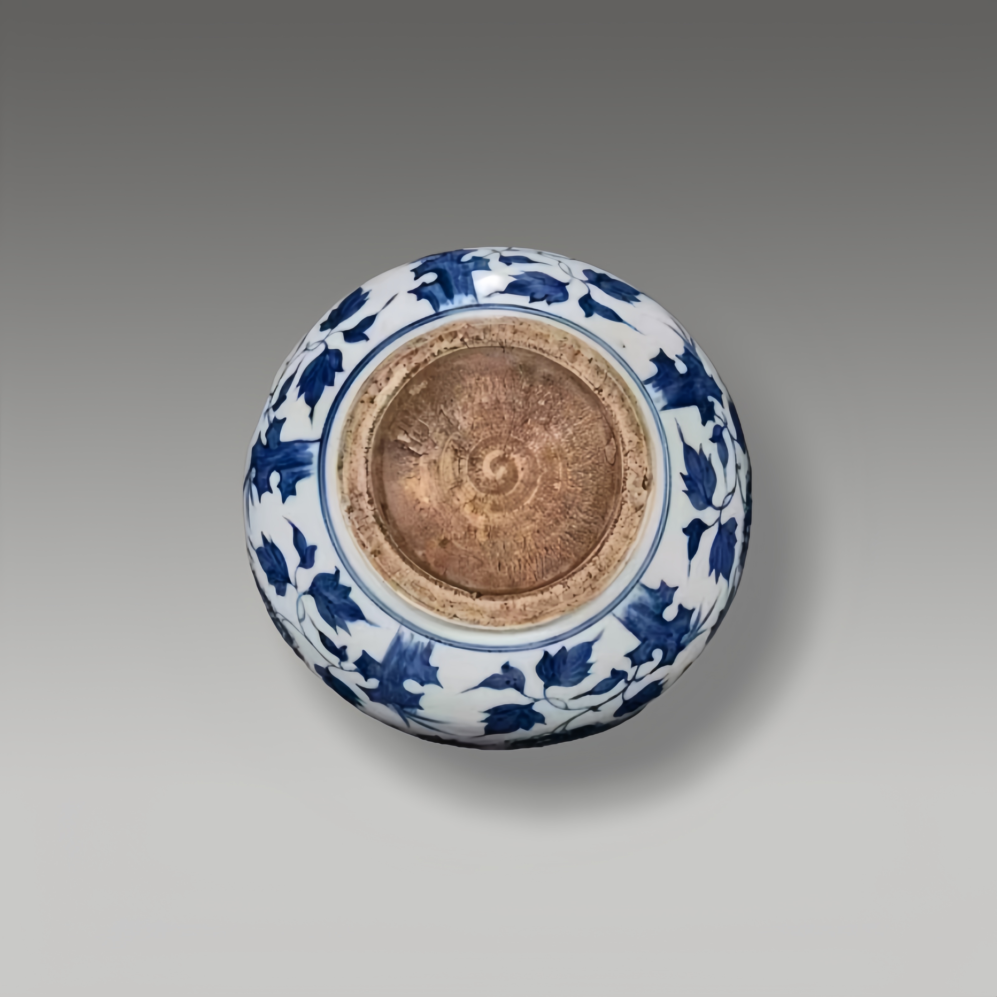 器型饱满规整,兽耳装饰立体生动。缠枝纹与几何纹搭配和谐,尽显青花瓷器的绘饰巧思与工艺韵味