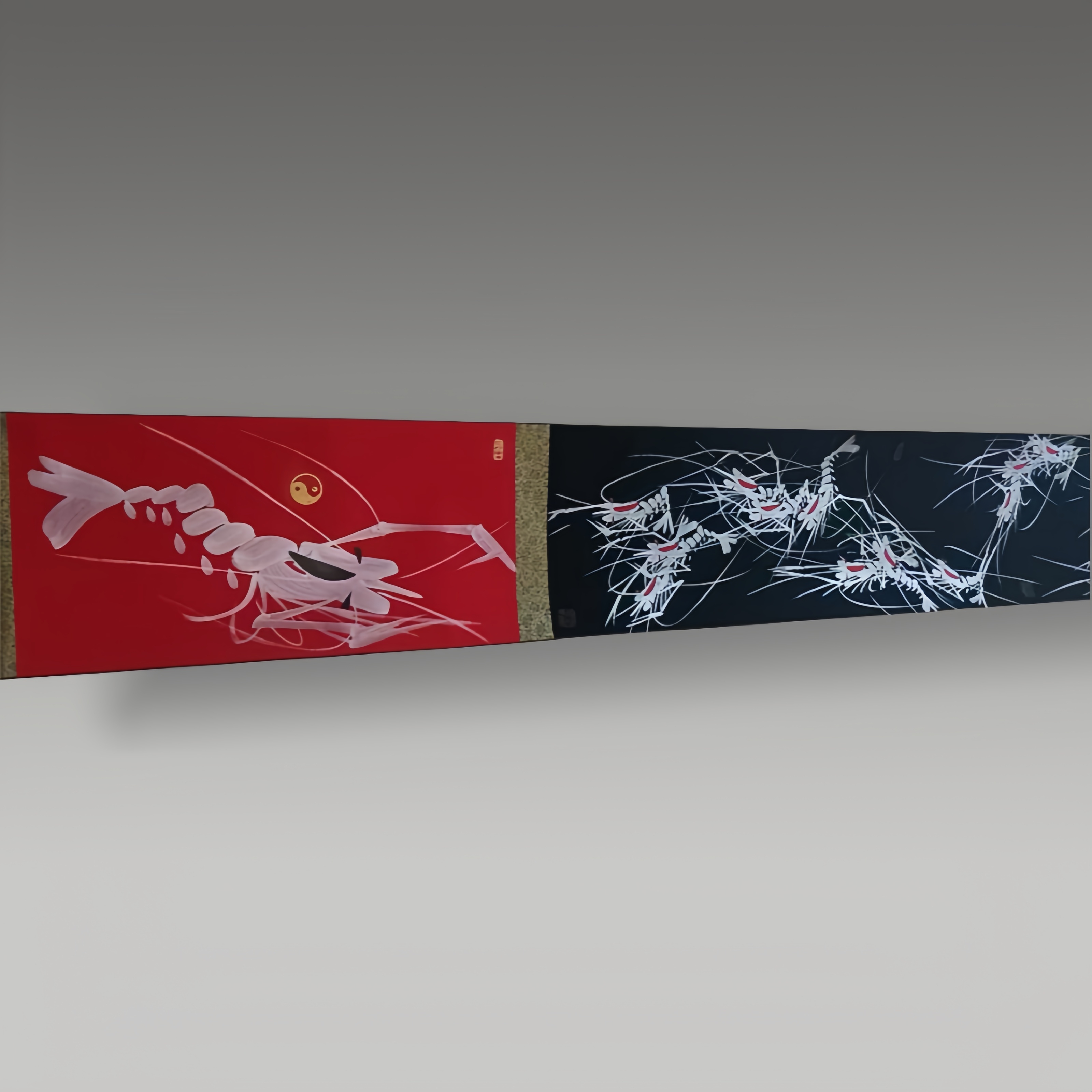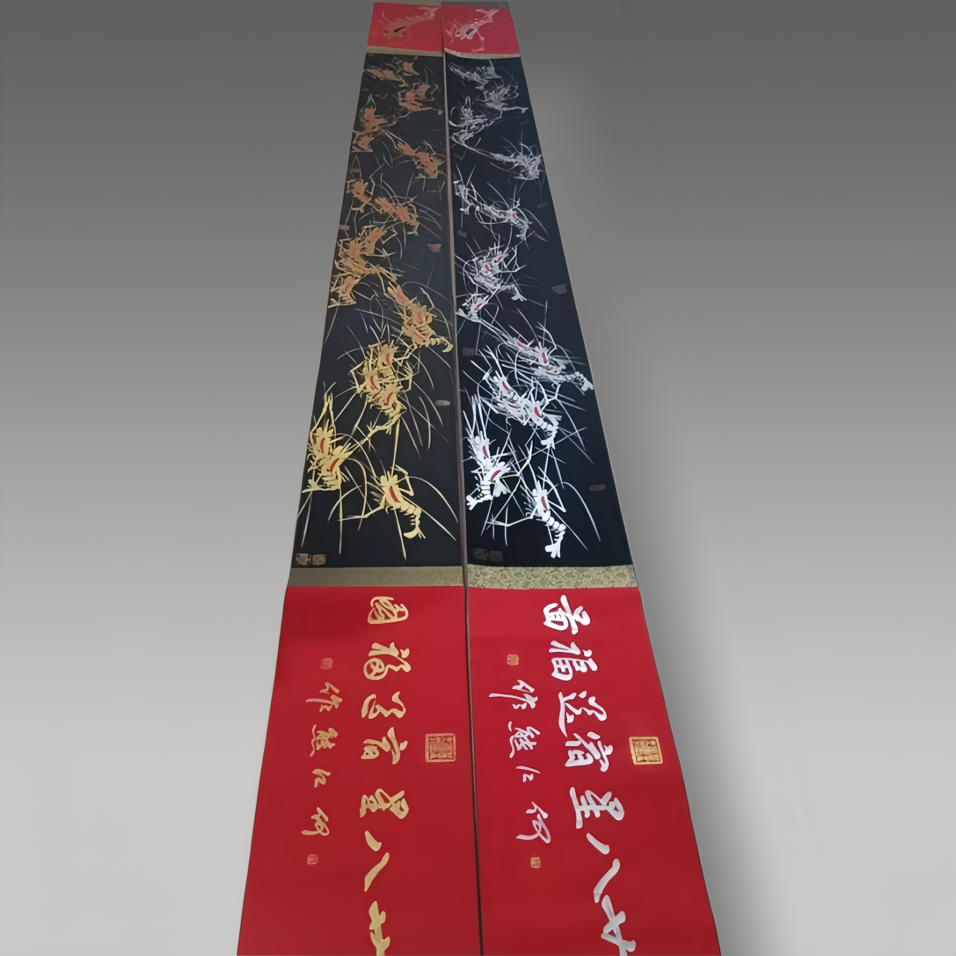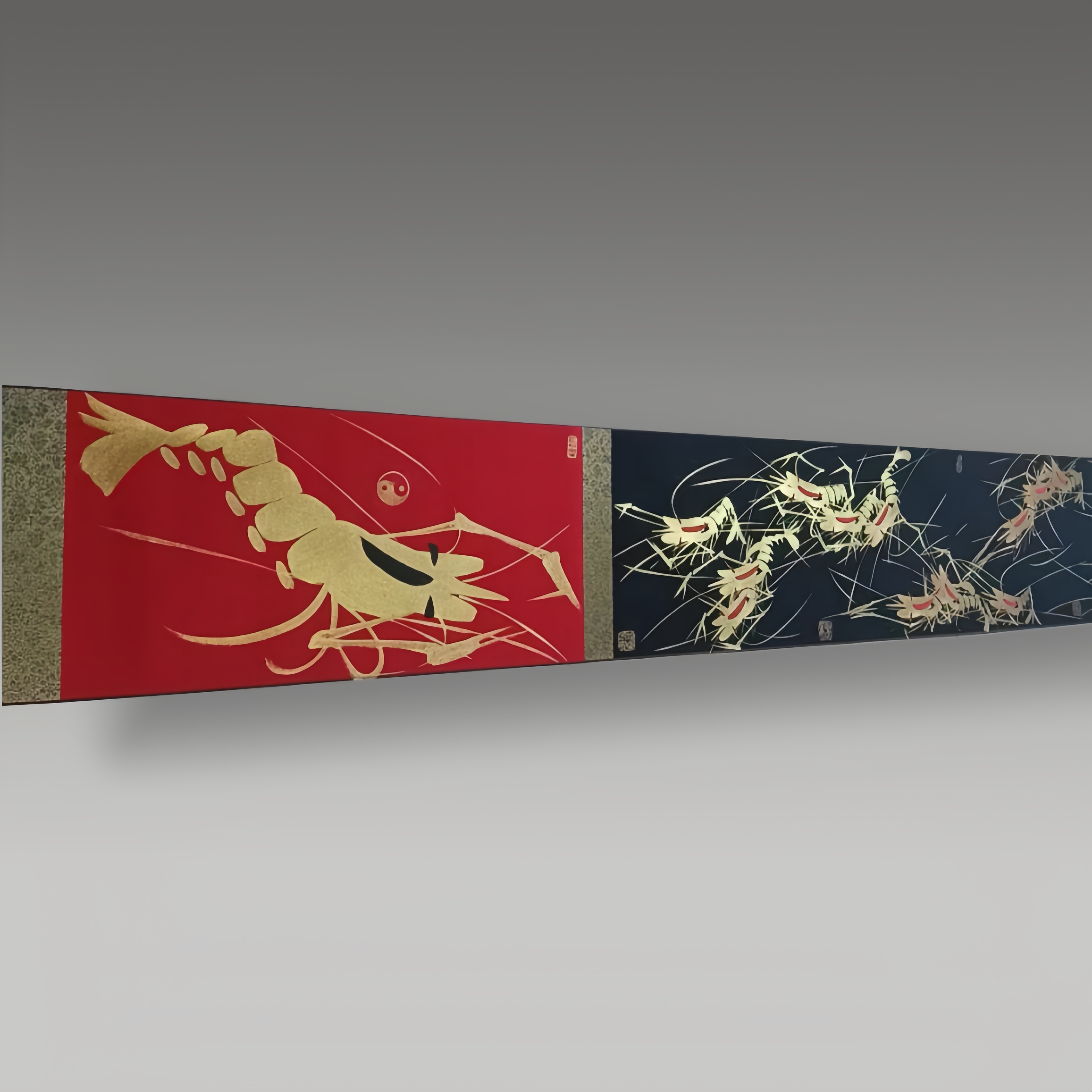 虾须灵动似游于碧波,红底书法笔力遒劲,金白字与虾图相映成趣,整组藏品融吉祥寓意与水墨妙趣