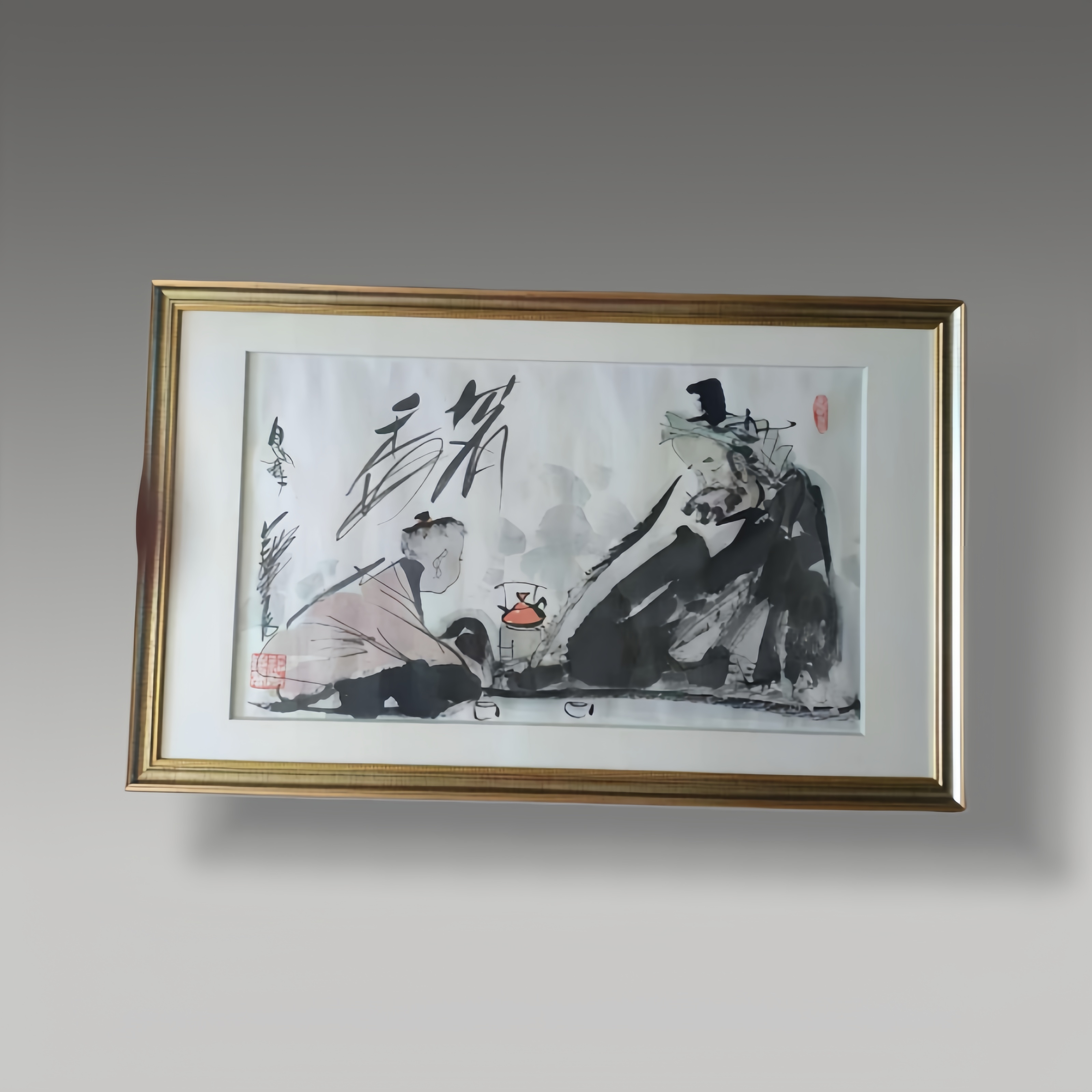 人物形神兼备,老者与童子对坐品茗,笔墨豪放却见细节。题字笔势洒脱与画面相融,尽显写意笔墨的灵动