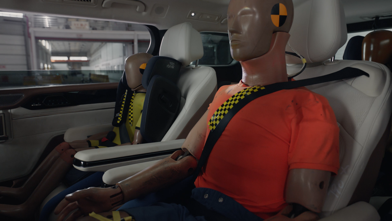 视频里,夏正在进行追尾测试,要求比美标还猛。重点看第三排:侧气帘秒速弹开,从车顶到座椅形成“安全护盾”,假人腿部空间完好无损,连座椅靠背都没明显位移。更戳我的是细节——后防撞梁用了热成型钢,配合吸能盒设计,追尾冲击力被层层卸掉,第三排乘客的“生存空间”硬是没被压缩。