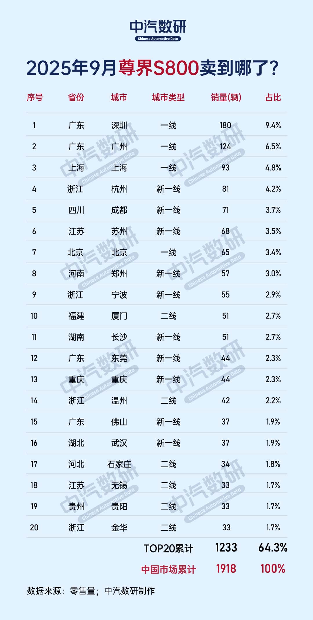 在销量TOP20的城市榜单中,深圳以180辆的销量成绩夺得月度冠军,成为尊界S800最受欢迎的城市,其销量表现远超其他城市。