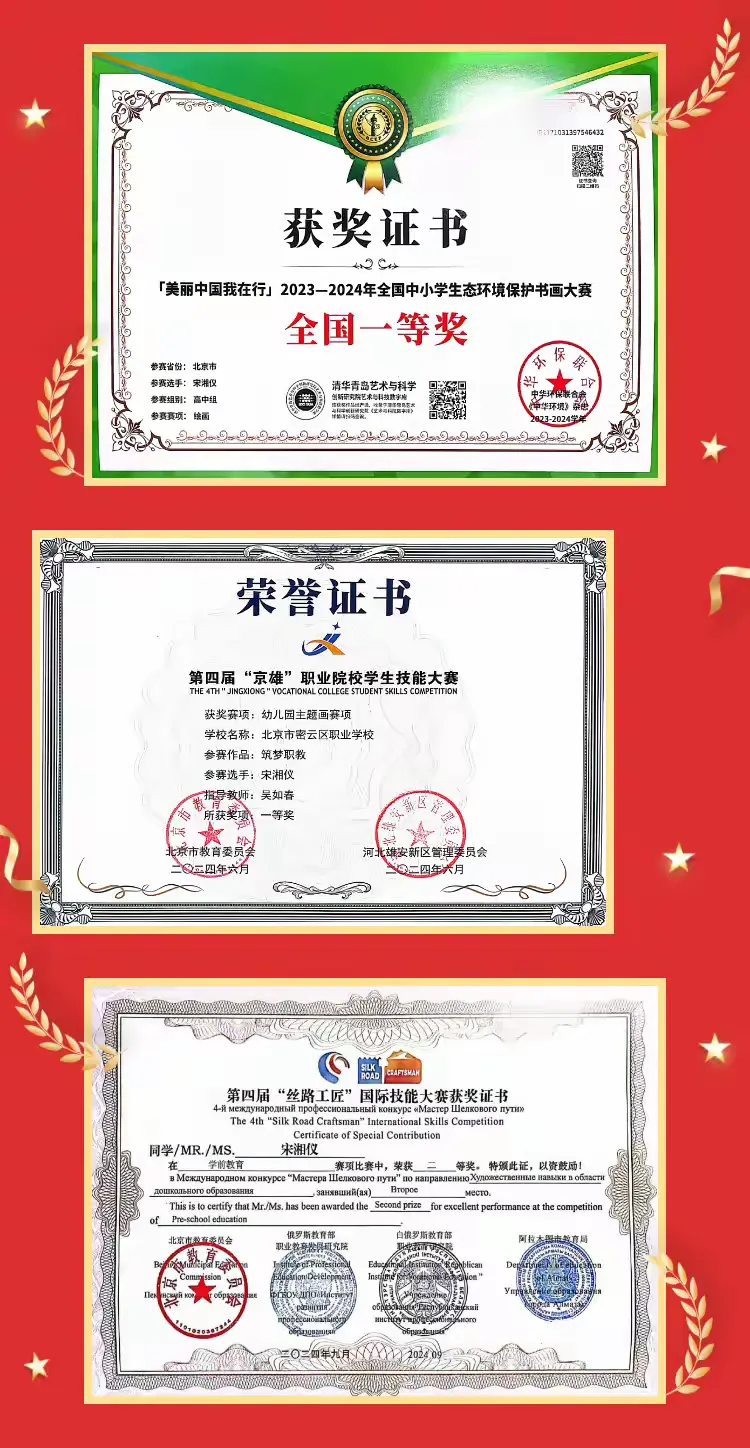 根据《北京市教育委员会北京市人力资源和社会保障局北京市财政局转发教育部人力资源社会保障部财政部关于印发《中等职业教育国家奖学金评审办法》文件的通知》(京教财〔2024〕5号)、《关于做好2025年中等职业教育国家奖学金和北京市政府奖学金评审发放与材料填报工作的通知》(京教资财〔2025〕79号)要求,经学生个人申报,班主任同意,专业室推荐,教务处、德育处核实,学校评审委员会研究,区教委审核、市教委审核,2025年12月,密云区职业学校幼儿保育专业学生宋湘仪获得国家奖学金。