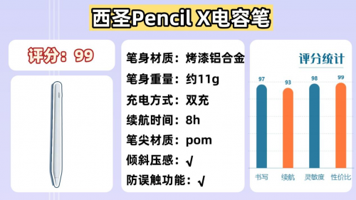 同时西圣pencil X的笔身设计符合人体工学,贴合指腹更容易捏握,书写顺手也更贴近中国用户的握笔习惯,重量仅有11g,和普通铅笔相当,长时间书写不疲惫,轻松解决传统电容笔笨重、握持不适的痛点。还采用双充电设计,支持磁吸式平板无线充电与Type-C有线快充两种便捷充电方式,可以随用随充,充一次电可以用个8小时,还有蓝牙实时显示电量,彻底告别电量焦虑,助力高效创作与学习。综合以上,我认为西圣Pencil X是性价比很高的一支平替电容笔,如果你平时喜欢在iPad上记笔记跟刷题,那么可以试试它!