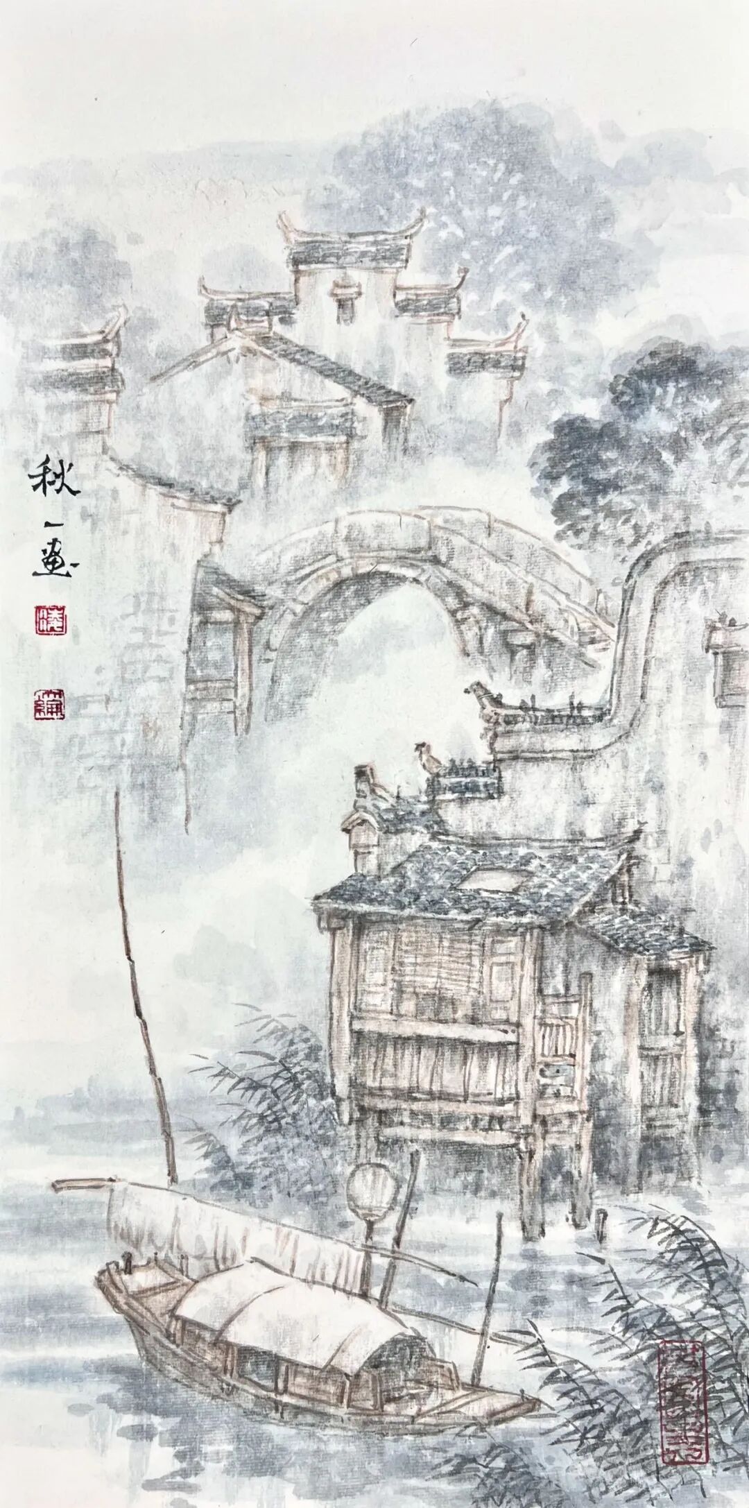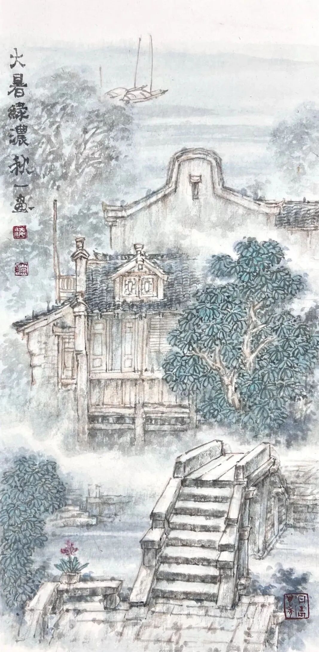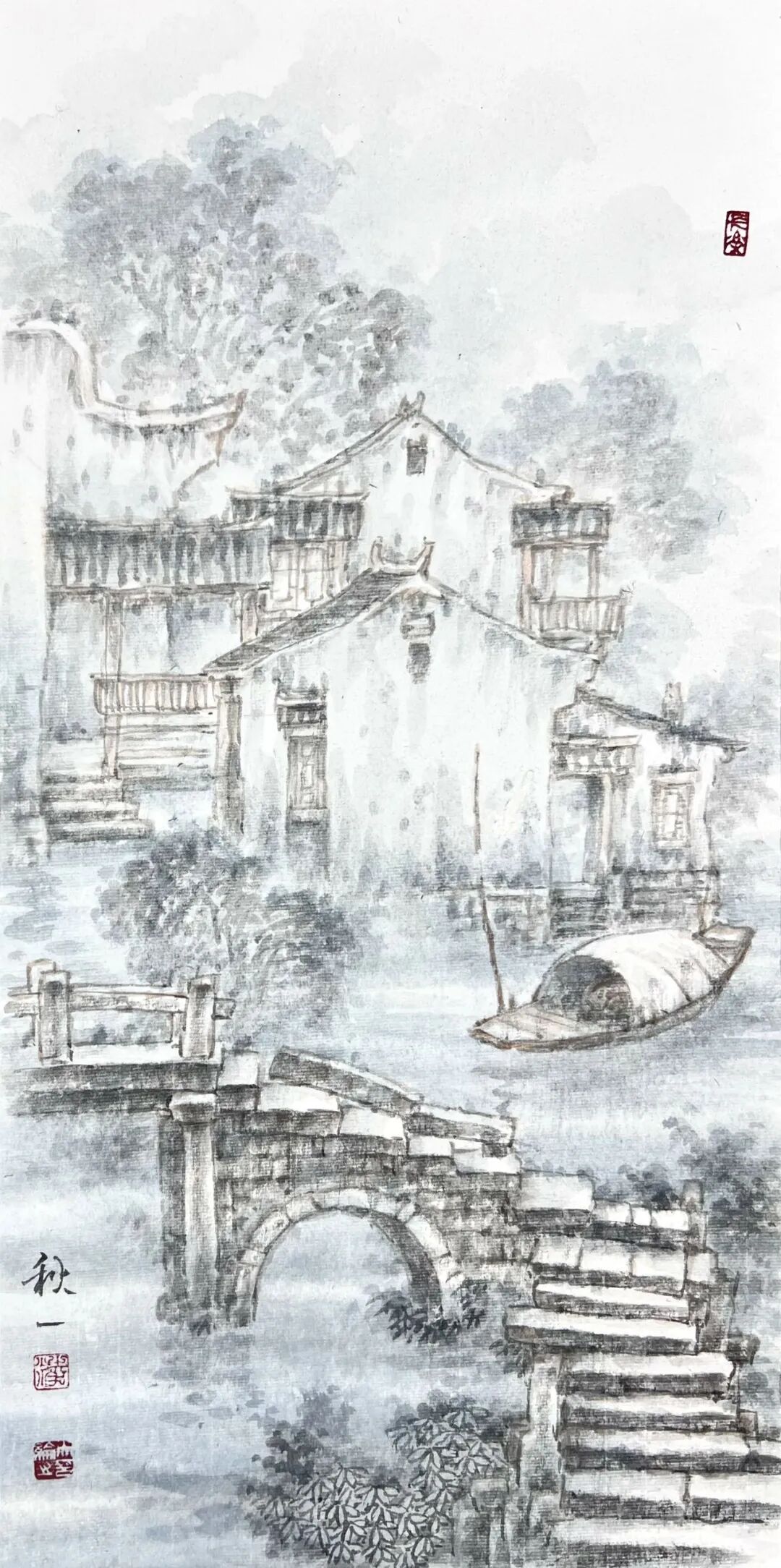 凌大纶别号秋一,1951年6月出生于上海,祖籍浙江湖州。山水画家,擅长描绘水乡田园和古镇风情,以江南烟雨朦胧水气氤氲的表现手法为特色,人称“凌烟云”。曾任嘉兴美术馆馆长、蒲华美术馆馆长、嘉兴画院院长。现为中国美术家协会会员、国家一级美术师、文化部国韵文华书画院艺委会委员、上海江南书画研究院副院长、嘉兴市文史研究馆馆员、嘉兴市政协书画会副会长。