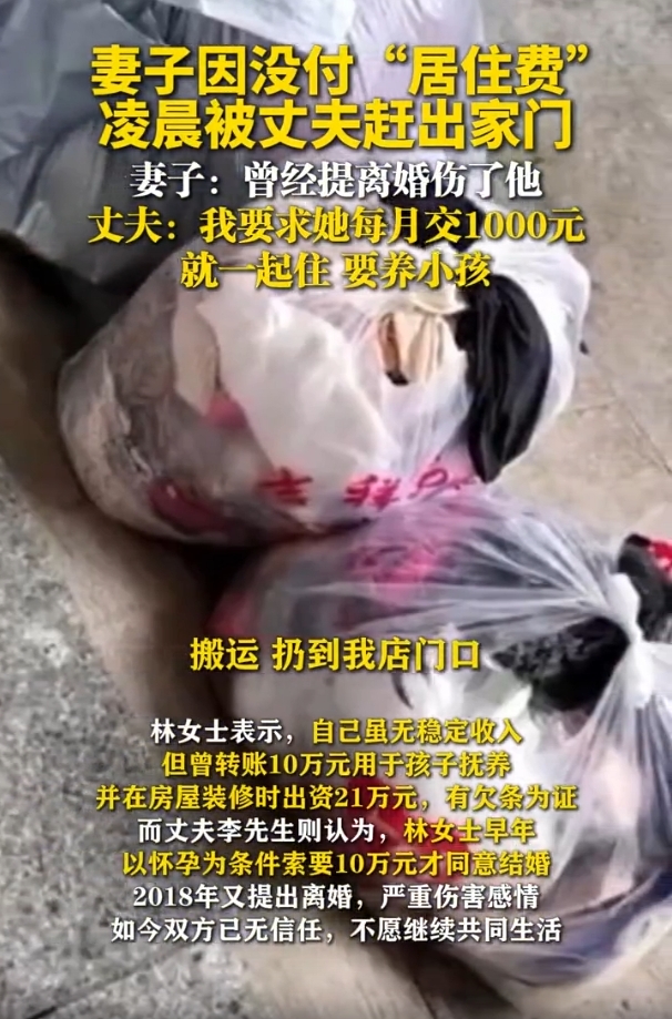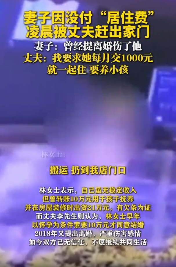 10 月 28 日,据第一帮帮团报道,林女士与其丈夫李先生因“居住费”一事产生了纠纷。在一个凌晨时分,林女士竟被丈夫无情地赶出了家门,双方就家庭开支、财产出资等诸多问题各执己见,僵持不下。