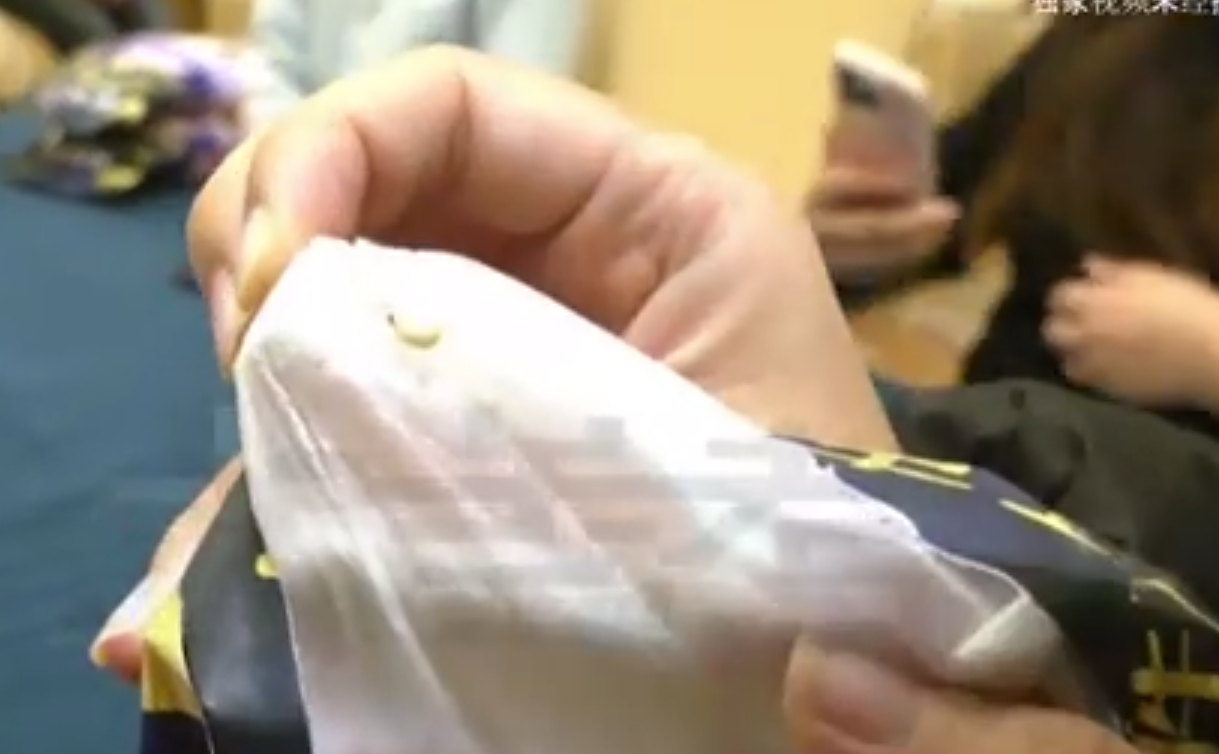 事件曝光后,媒体在拆开霍女士家中尚未拆封的苏菲安心裤包装时,全场傻眼了,一条好大的乳白色的虫子趴在里面。因现场拆封的,品牌方也没办法找其他说辞。