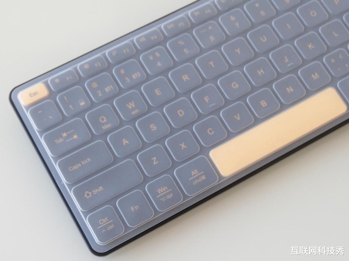 键帽是 ABS 材质带轻微磨砂,字符用了双色注塑工艺,不用担心用久了掉色模糊,这点比我之前那些 “打油” 的键盘强多了。键盘还自带一张键盘膜,防尘防泼溅,对于我这种总把咖啡放桌边的人来说太刚需了。哦对了,它居然挺轻薄,最薄的地方才 1 厘米左右,重量也超级轻,就算是日常家与学校两地互带都无压力。