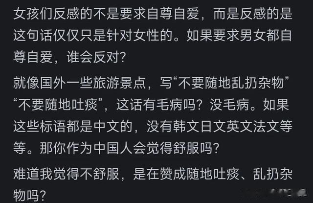 是个人都要自尊自爱,无关性别。但如果你不自尊自爱,看到别人都自尊自爱,那你确实会觉得这个词恶心,好像在针对你。