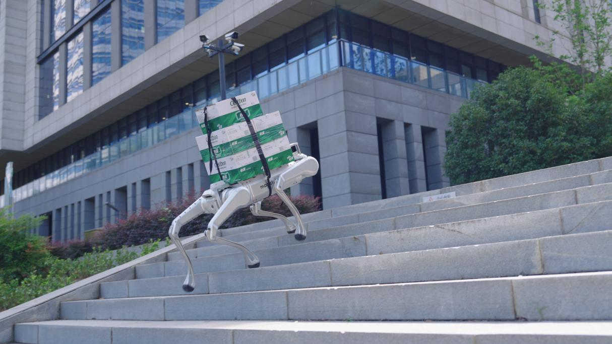MagicDog Y1全地形能力优秀,可攀爬45°斜坡、跨越最高达40厘米台阶,也可完成双腿倒立下楼梯等高难度动作,在砂石、草地、浅滩等复杂场景中依然如履平地。Y1搭载多模态传感器,结合感知融合与动态控制系统,实现全域环境理解与实时路径规划;同时依托优秀的平衡控制与运动算法,面对复杂路况与高强度外界冲击等,Y1亦可保持平衡稳定,是实至名归的“全地形王者”。
