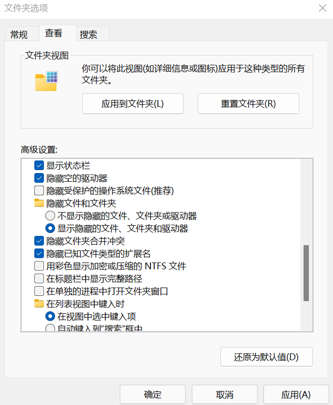 在文件夹选项中取消勾选隐藏受保护的的操作系统文件,和勾选显示隐藏的文件,文件夹和驱动器。