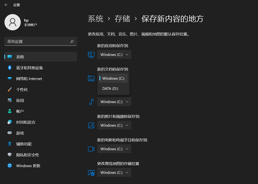 (2)在系统设置-系统-存储-高级存储设置-保存新内容的保存位置,可以将系统默认的几个文件夹路径修改为其他磁盘。