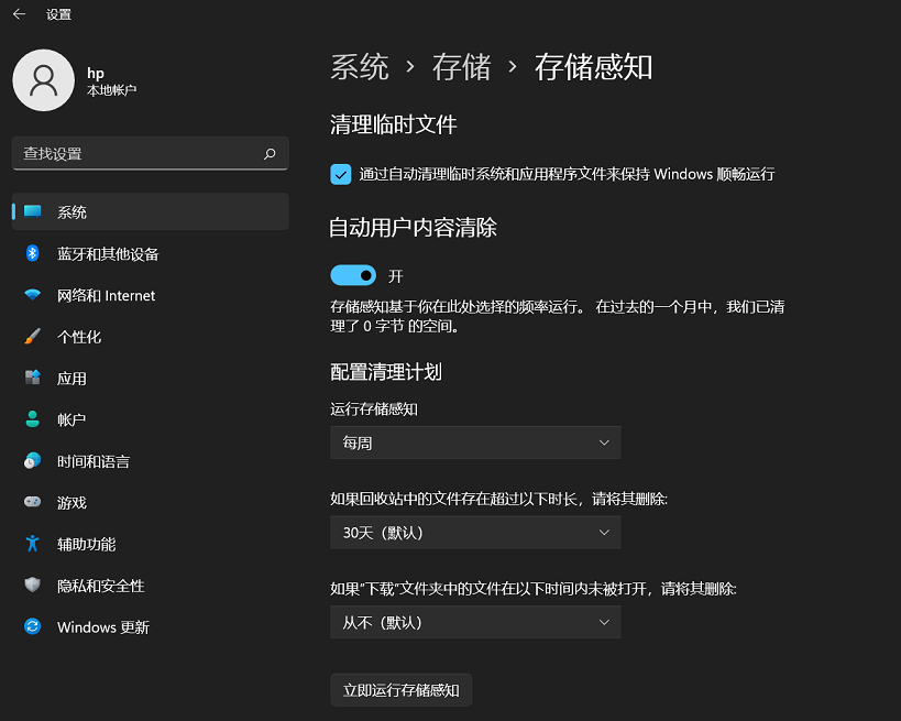 那么经常来清理是不是会觉得麻烦呢,这一点微软也替我们想到了。【存储感知】,就是能帮助我们自动清理这些文件的功能。