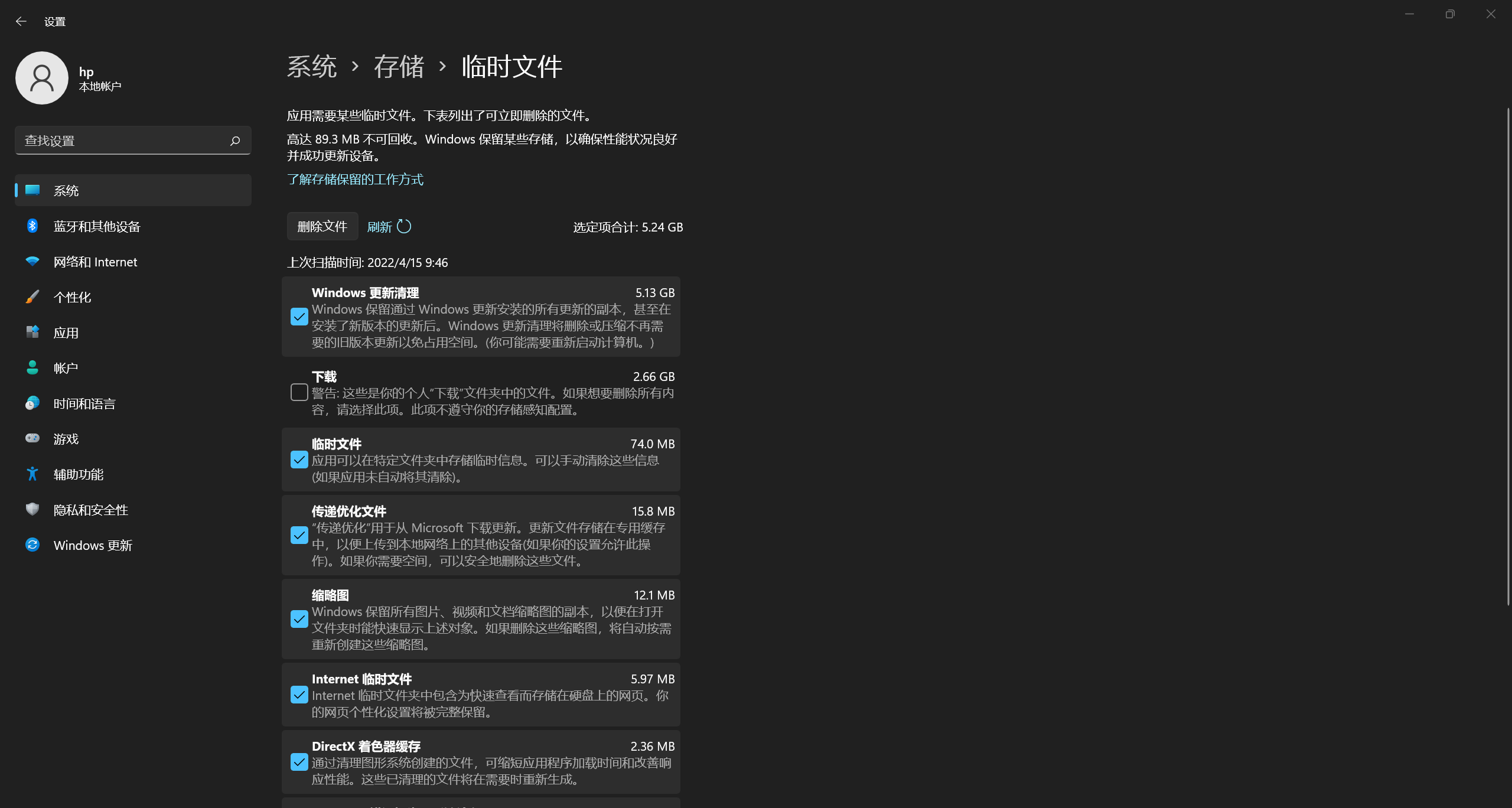 在临时文件中,占用最多的两项为“windows更新清理“和"下载"