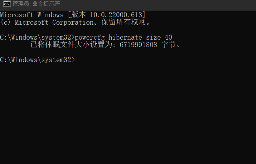 此命令可以将休眠文件体积设置为运行内存的 40%(由于系统限制,40% 为最小值),这样休眠文件就可以占用更少的空间啦。