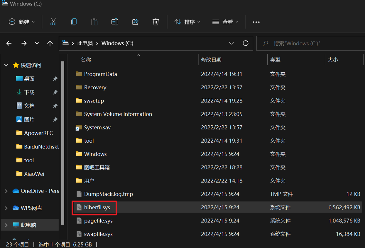 系统中有一个默认开启的快速启动功能,开启这个功能则需要开启休眠,会在C盘根目录下生成一个休眠文件,文件的也非常的大,我们可以手动来限制下大小。