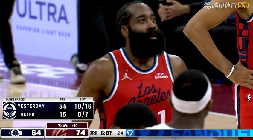 双核驱动就是不一样啊,快船攻防两端都提升一个层次,比分上一直稳压对手一头,骑士也不敢轻易包夹哈登了。