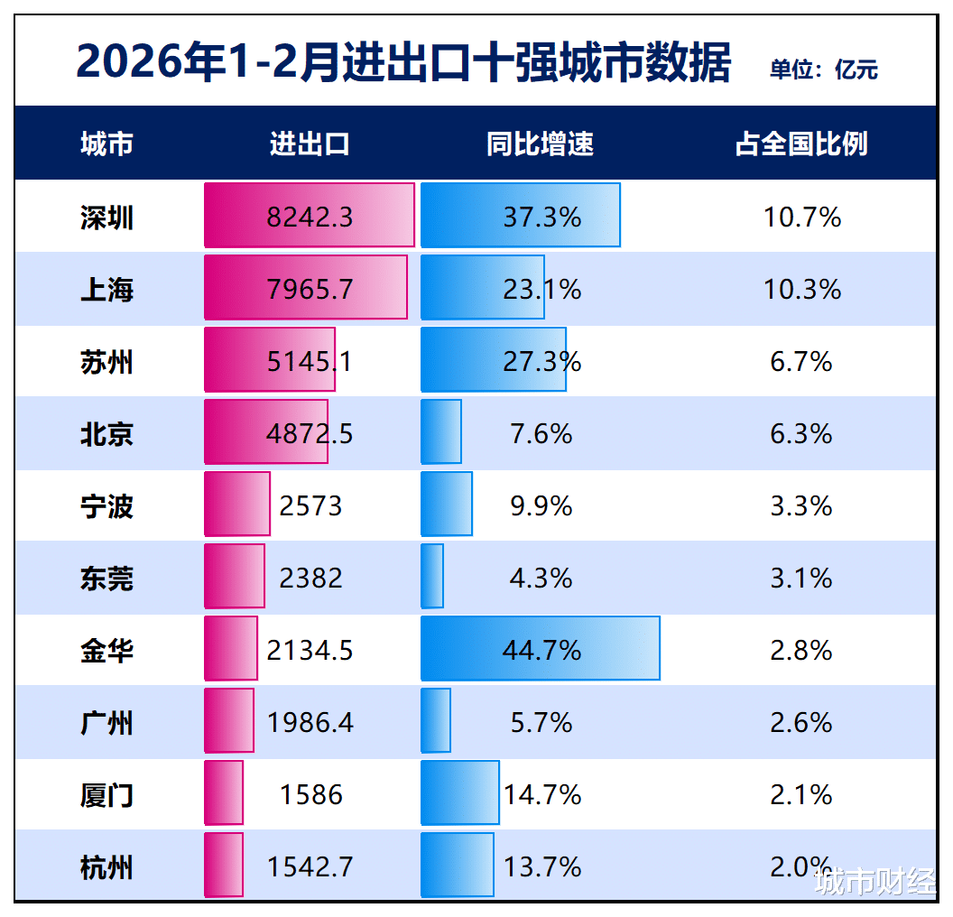 今年前2个月,深圳累计进出口规模保持内地城市首位,达8242.3亿元,同比增长37.3%。其中,出口4943.6亿元,增长35.5%;进口3298.7亿元,增长40%。