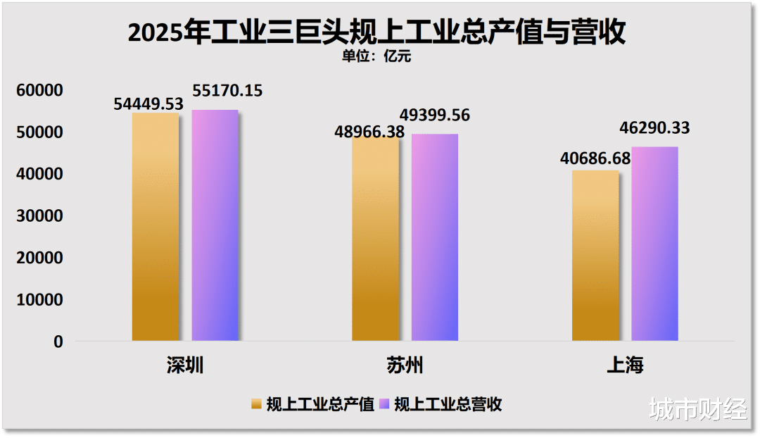 2025年,深圳规上工业总产值54449.53亿元,第二城苏州48966.38亿元,第三城上海40686.68亿元。