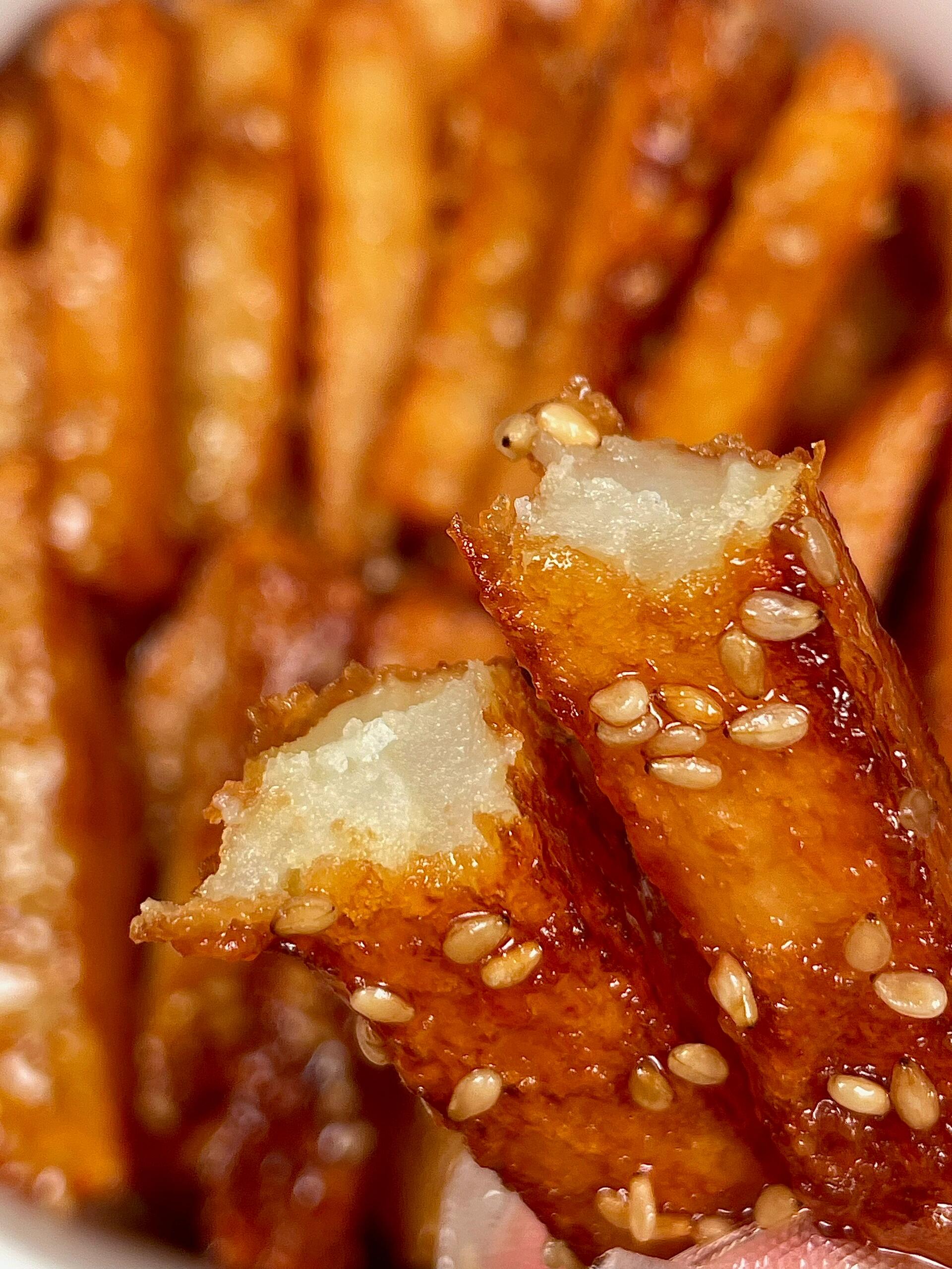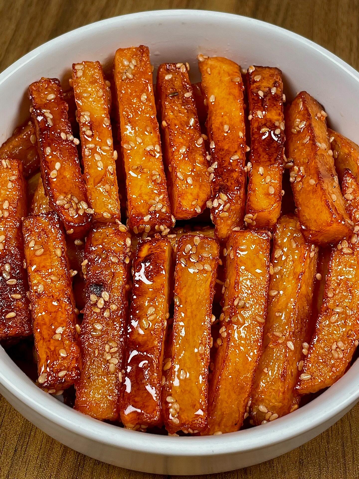 把糖醋土豆条盛进盘子里,撒上一点白芝麻点缀,红亮亮的色泽看着就让人食欲大开。趁热夹起一根,先感受到的是糖醋汁的粘稠和酸甜,接着是外皮的酥脆,最后是里面软糯的土豆香,层次分明,一口接一口根本停不下来!